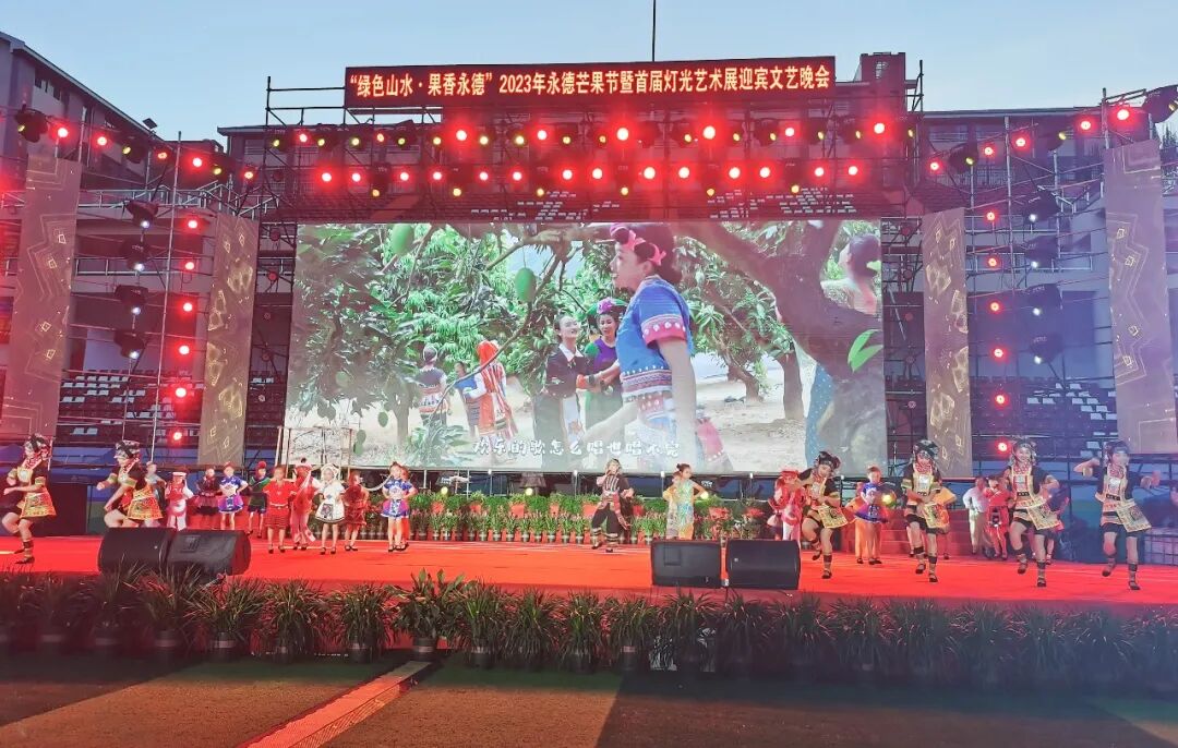 在2023年临沧永德芒果节暨首届灯光艺术展节庆活动中,四方宾客齐聚永德,尽享节日精彩。开幕迎宾晚会上,“人文永德、果香永德、宜居永德、幸福永德”四个节目篇章,以永德人文地理和民族风情为元素,向观众展示了永德人民群众团结奋进、拼搏向上、与时俱进的时代风采,深情讴歌了边疆各族人民的幸福生活。