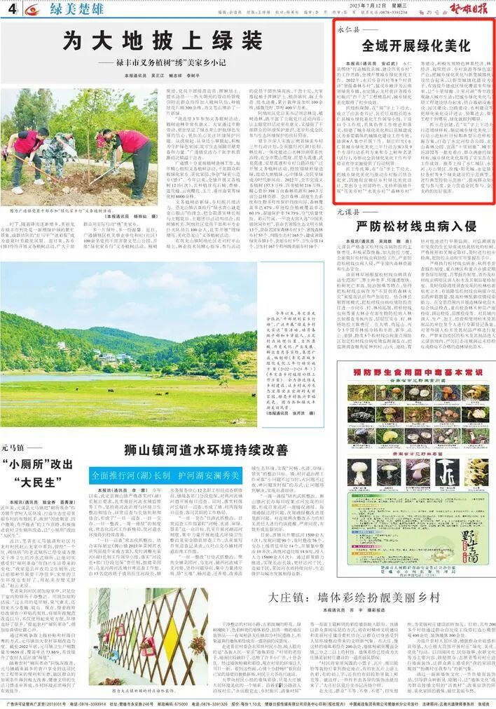 楚雄州永仁县围绕“打造精致县城、建设四美乡村”的工作思路,全域开展城乡绿化美化工作。2022年,永兴乡昔丙村等8个村获评“省级森林乡村”,猛虎乡被评为云南省绿美乡镇,永定镇云龙村获评省级乡村振兴“百千万”工程精品村,城乡绿化美化取得了初步成效。抓组织保障,在“领”字上下功夫。成立了由县委书记、县长任双组长的永仁县城乡绿化美化工作领导小组,下设11个工作组,具体负责工作推进和落实,组建了城乡绿化美化和以县城建成区为重要载体的城镇化建设工作专班,抽调6人集中开展工作。制订印发《永仁县城乡绿化美化三年行动方案》及9个专项行动系列方案和乡土树种名录(试行),为推动全县绿化美化工作科学稳妥有序实施提供了行动纲领。抓工作统筹,在“合”字上下功夫。把城乡绿化美化与推动乡村振兴结合起来,因地制宜做好乡村绿化美化设计,突出乡土田园特色,支持和鼓励开展“花美乡村”“水美乡村”“森林乡村”等建设,积极发展特色林果经济、林下经济、庭院经济、乡村旅游等绿色富民产业;把城乡绿化美化与新型城镇化建设结合起来,以新型城镇化建设为抓手,有效提升建成区绿化覆盖率和绿地率,让“十里绿廊、十里河湖”等市政景观融入城市生活;把城乡绿化美化与各项工程建设结合起来,结合基础设施建设、园区建设、公路建设、水利建设等,把绿化美化设计进去、预算进去,做到工程干到哪里、绿化就跟到哪里。抓示范创建,在“实”字上下功夫。打造增绿样板,制定城乡绿化美化三年行动示范标杆目标和典型示范样板实施方案,打造了永定河综合公园、龙头山森林公园、宜莲“十里画廊”、城市广场游园等一批有看点、群众满意的绿美样板,城乡绿化美化取得了实实在在的工作成效。推荐上报了永仁城区、永定河、方山景区、玫瑰·阳光城、永定镇麦拉务村等9个绿美建设的示范典型,并进行典型经验示范推广,提高群众知晓度与参与度,全力营造全民参与、全民支持的良好氛围。