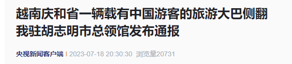 据央视新闻客户端消息,7月18日,中国驻胡志明市总领事馆发布通报称,当天一辆载有21名中国游客的旅游巴士在越南庆和省发生侧翻事故。接报后,领事馆立即启动中国公民领事保护应急响应机制,协调庆和省外事及公安等部门全力开展救援,并联系就近中资企业人员前往事发地及医院协助救援、救治。同时,已安排人员飞赴庆和省协调救援、救治。