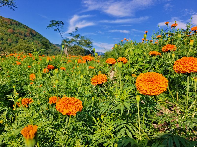 在种植万寿菊的村村寨寨,一朵朵娇艳的万寿菊竞相开放,连片的花海在蓝天的映衬下,犹如一幅艳丽的画卷,在漫山遍野上缓缓铺开。