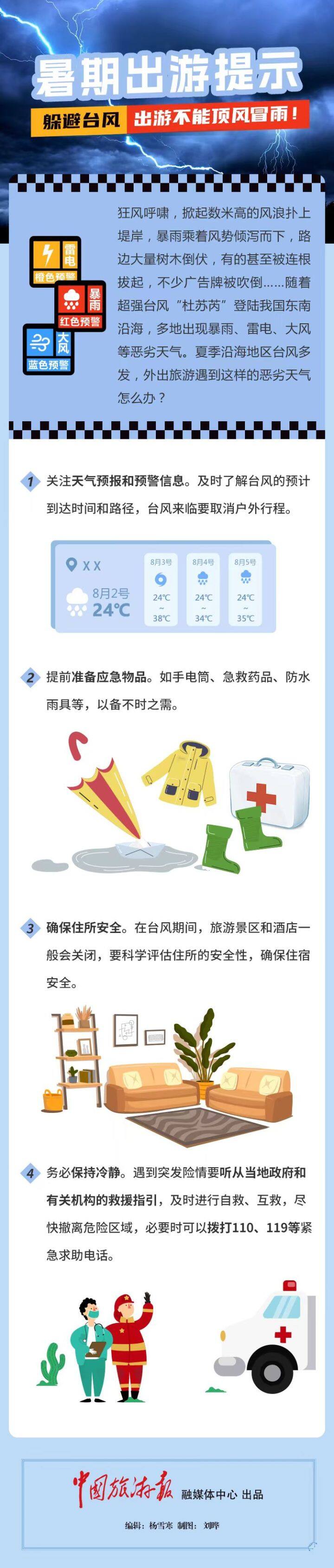 狂风呼啸,掀起数米高的风浪扑上堤岸,暴雨乘着风势倾泻而下,路边大量树木倒伏,有的甚至被连根拔起,不少广告牌被吹倒……随着超强台风“杜苏芮”登陆我国东南沿海,多地出现暴雨、雷电、大风等恶劣天气。夏季沿海地区台风多发,外出旅游遇到这样的恶劣天气怎么办?