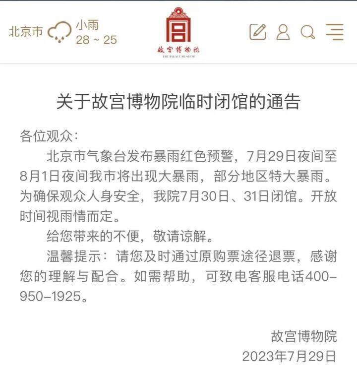 7月29日晚,故宫博物院发布通告,北京市气象台发布暴雨红色预警,7月29日夜间至8月1日夜间北京市将出现大暴雨,部分地区特大暴雨。为确保观众人身安全,故宫博物院7月30日、31日闭馆。开放时间视雨情而定。