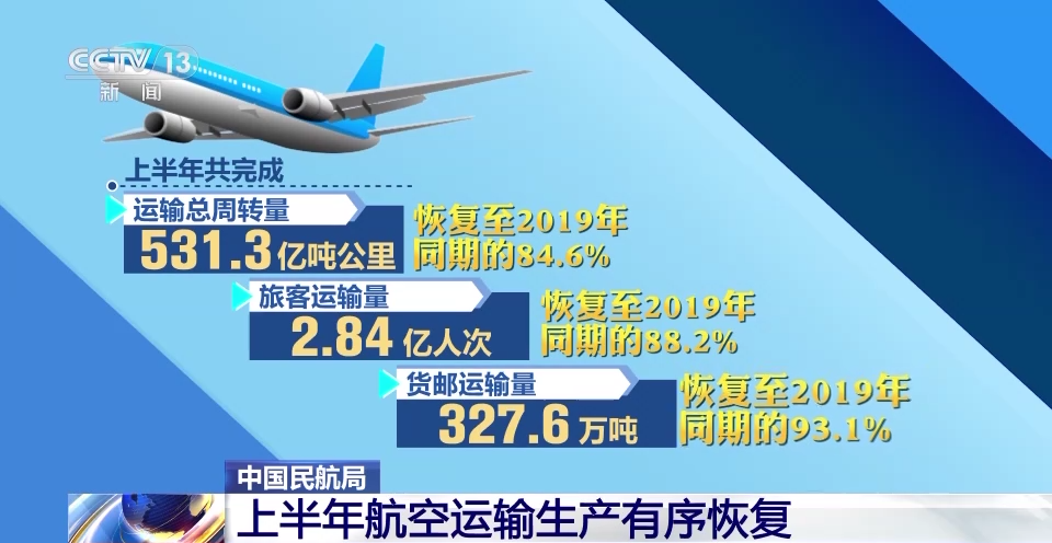 上半年共完成运输总周转量531.3亿吨公里、旅客运输量2.84亿人次、货邮运输量327.6万吨,分别恢复至2019年同期的84.6%、88.2%、93.1%,行业整体呈现恢复稳健、运行安全、竞争有序的良好局面。