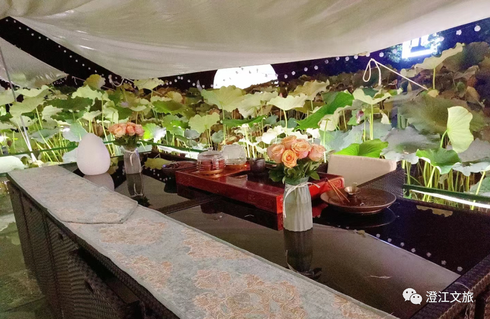 隐匿在荷田里的露营星空吧,柔和的灯光烘托出满满的氛围感,跟随现场乐队的音乐轻轻摆动身体,在夏日的慢时光里,你有故事,我有酒。