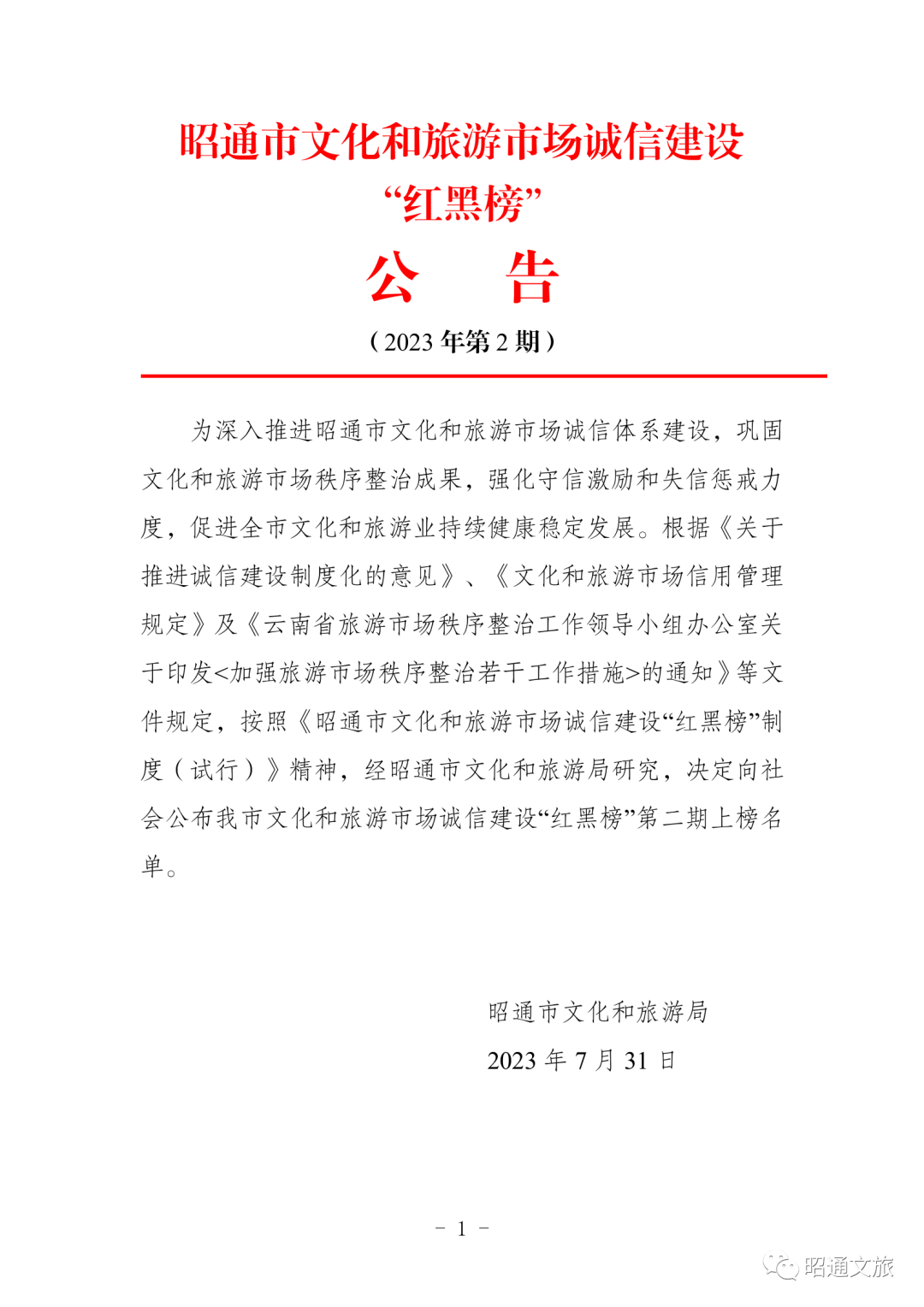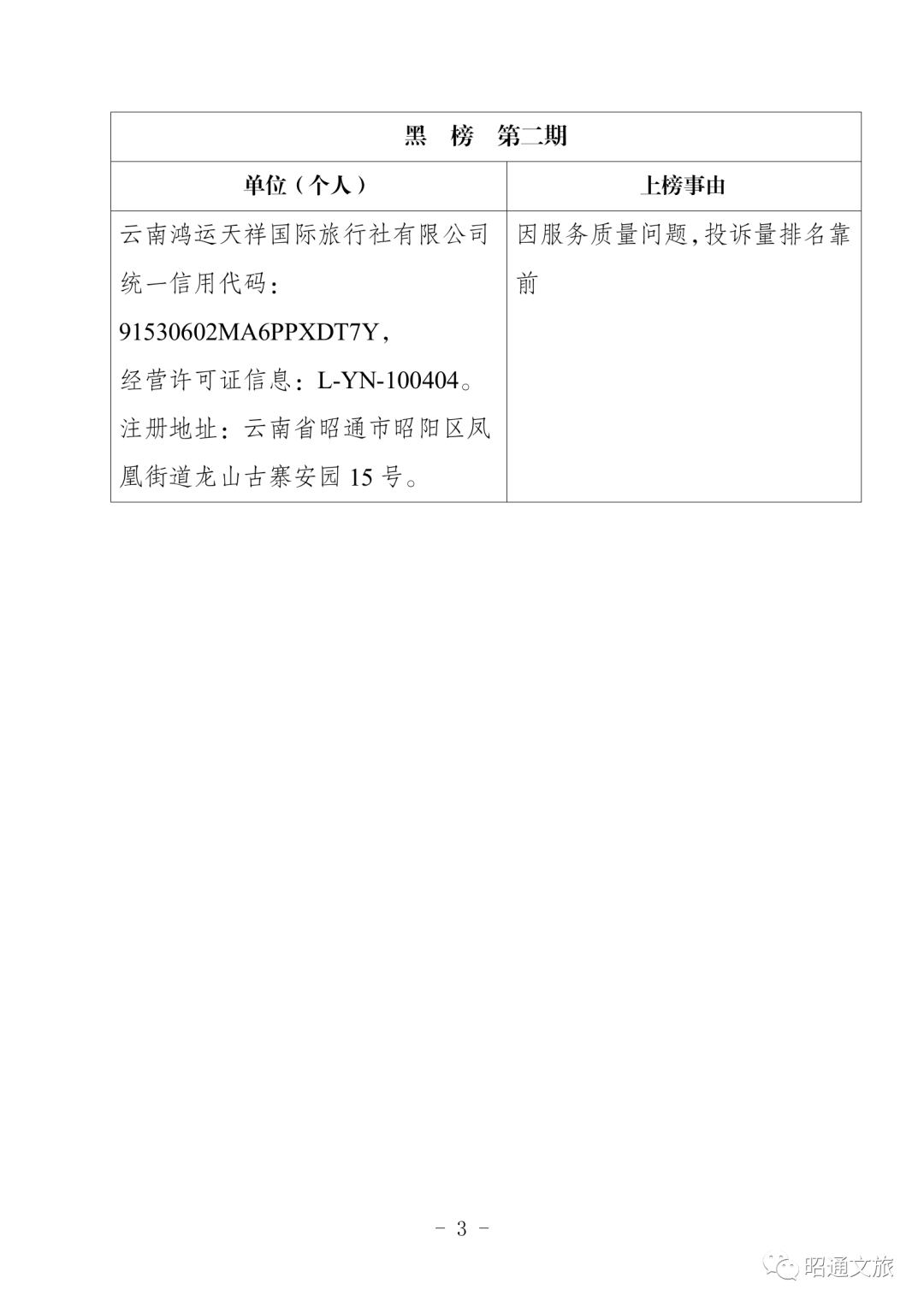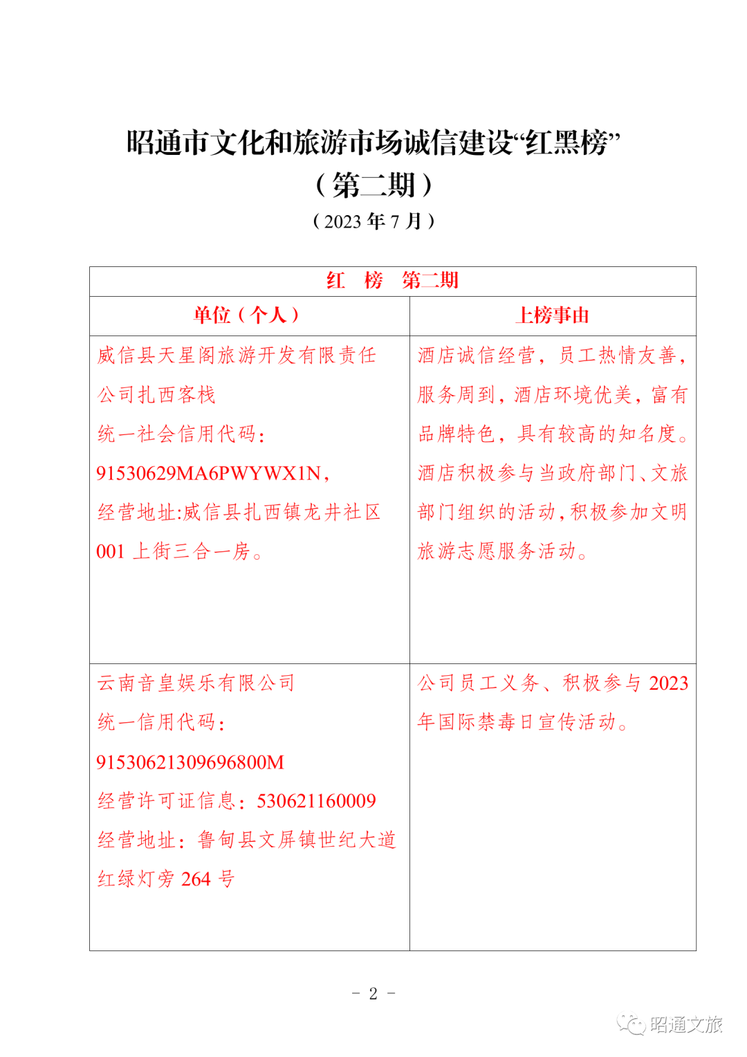 昭通市发布文化和旅游市场诚信建设“红黑榜”(第二期)