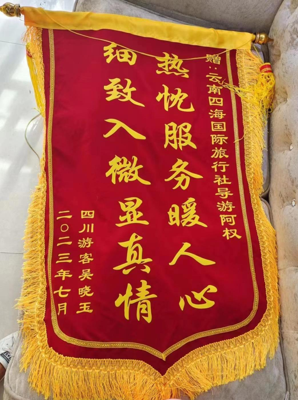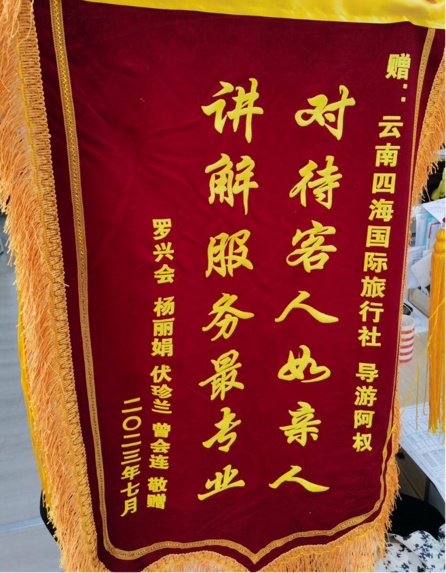 导游是云南形象的窗口和代言人,使命在肩。从业以来,郭太权经常收到四川、广东、福建、西安等各地游客的锦旗。近日,就有游客评价郭太权:“热忱服务暖人心,细致入微显真情”。