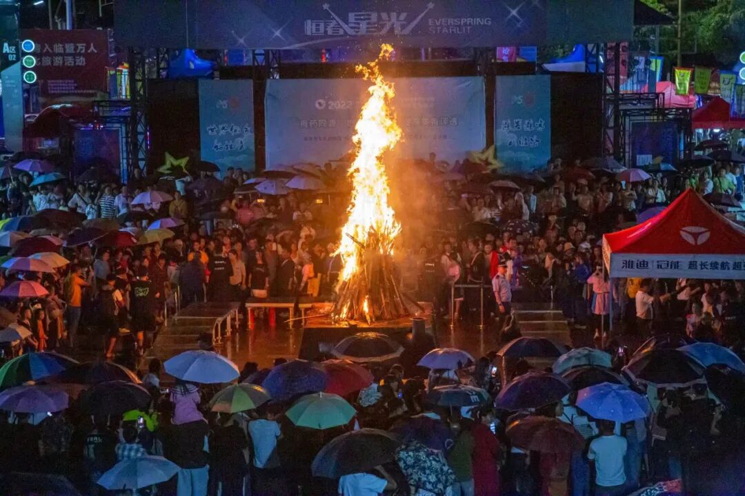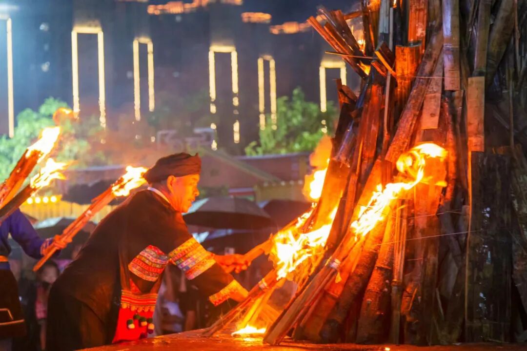 大家手中的点点星火汇聚成祝福的海洋,将当晚的火把节推向高潮。歌声悠扬,火光灿烂,条条火龙腾飞,带来希望和欢乐。