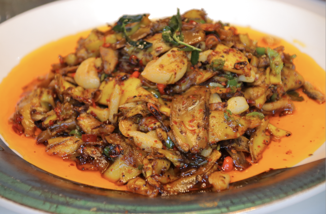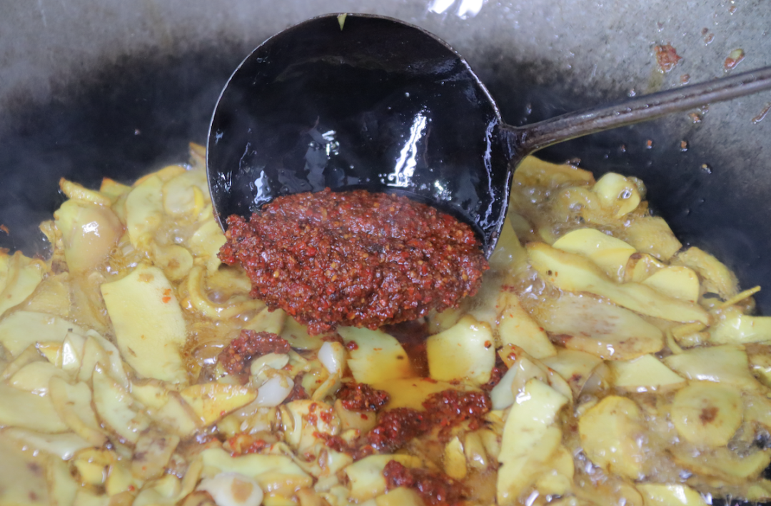 玉溪老酱是以上好的黄豆、花生、辣椒面、红糖、盐等为原料,经过炒制、蒸煮、发酵、晒制等工序制作而成的一种酱料。其特点是颜色赤红,口感鲜辣微甜,气味独特,是玉溪人餐桌上必不可少的调味品之一。在红塔区的食谱里,万物皆可放酱,来自山林间的美味野生菌也难逃这个定律,所以就有了老酱炒野生菌这一别具风味的特色菜肴。