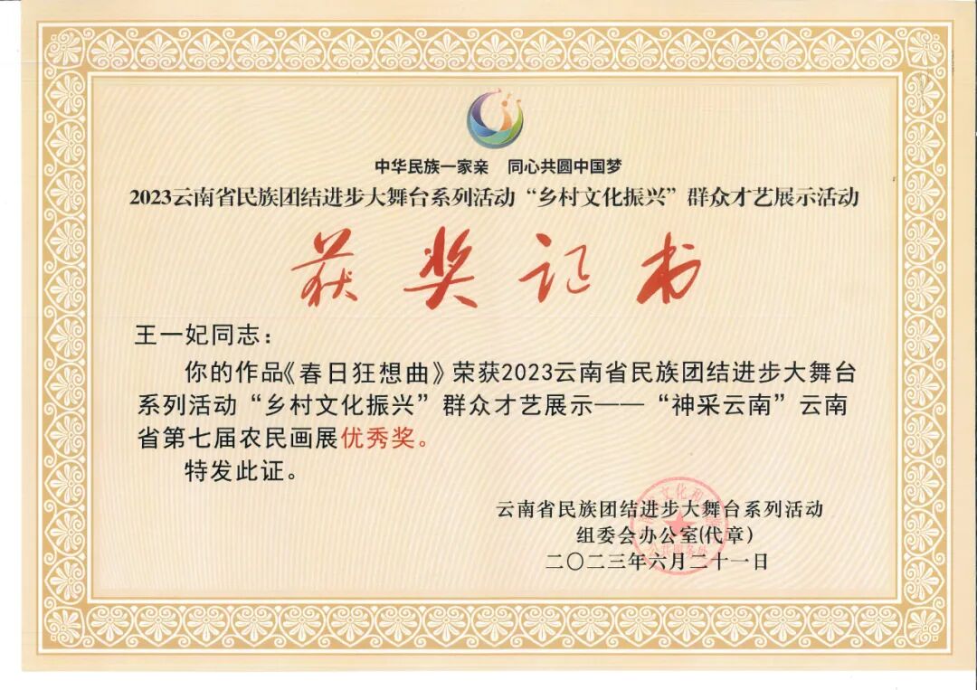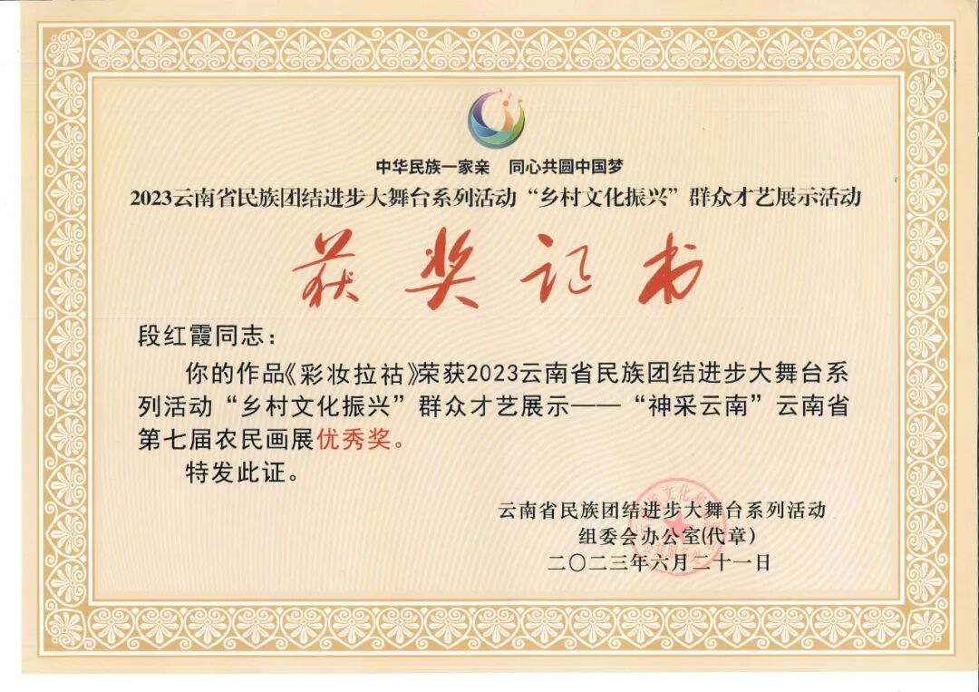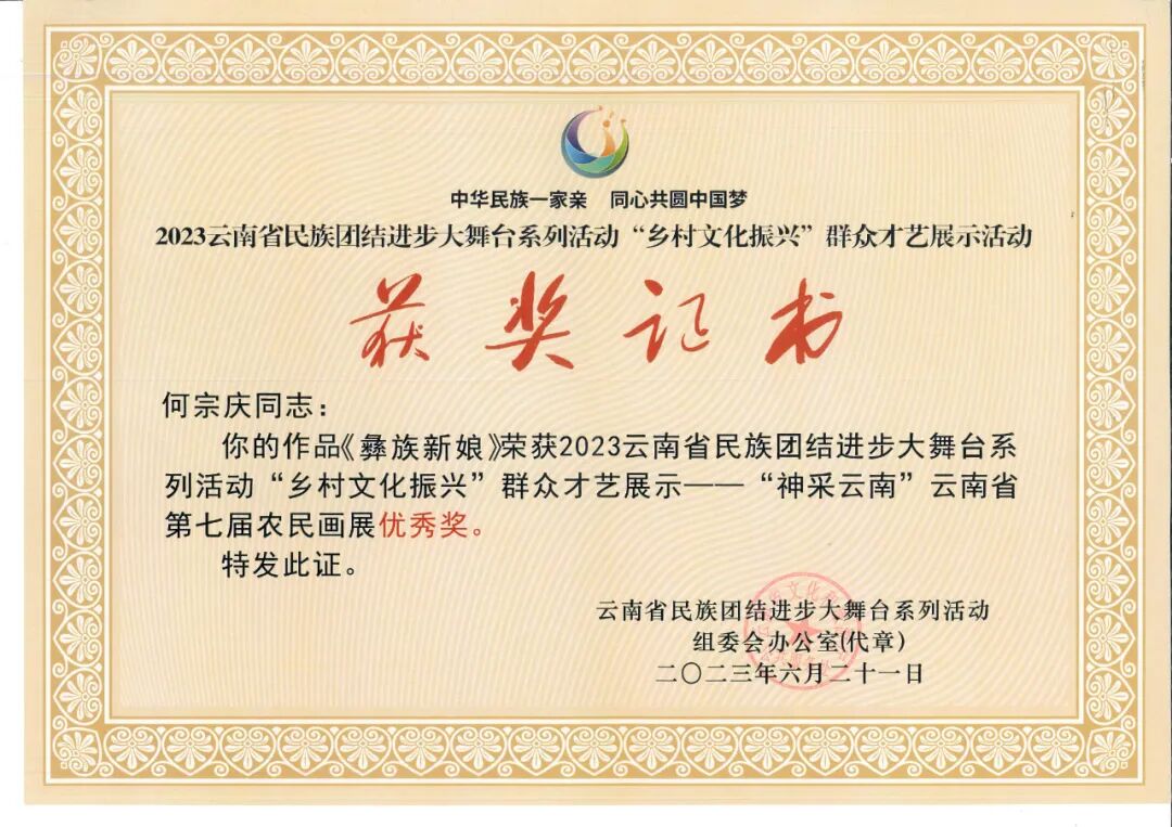 日前,省文化和旅游厅、省民宗委员会、省人力资源和社会保障厅、省农业农村厅、省乡村振兴局联合公示云南省民族团结进步大舞台系列活动“乡村文化振兴”群众才艺展示活动获奖作品,临沧市何宗庆的《彝族新娘》、段红霞的《彩妆拉祜》《柴烧窑》、王一妃的《春日狂想曲》4件作品获评全省农民画展、创意短视频优秀作品称号。
