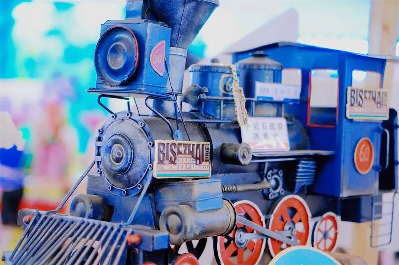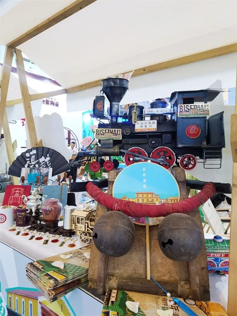 百年滇越铁路历史悠久,此次集市中展示了一个还原制作的“米轨火车头”,以及不同材质和形态的蒸汽火车和拥有百年历史的马鞍,还有笔记本、印章等文创产品。