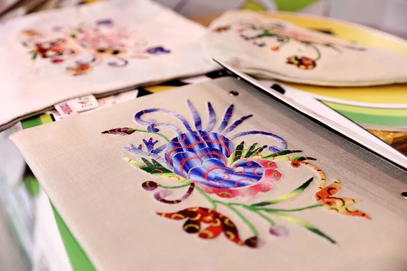 石屏彝族刺绣,山茶花、蝴蝶、马缨花等图案栩栩如生,既有手袋、背巾、马褂等实用物品,也有戒指,钥匙扣、冰箱贴等小巧的物件。