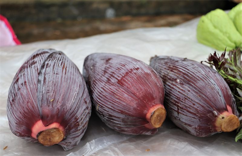 在坝浦河街,2块钱一把的野菜、3块钱一堆的芭蕉花、4块钱一公斤的野葡萄、5块钱一个的笋随处可见,还有野生菌、野生蜂蜜、生态黄鳝也应有尽有。