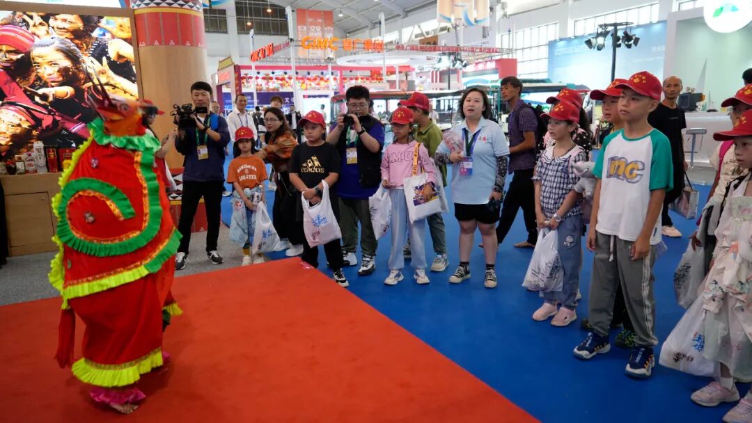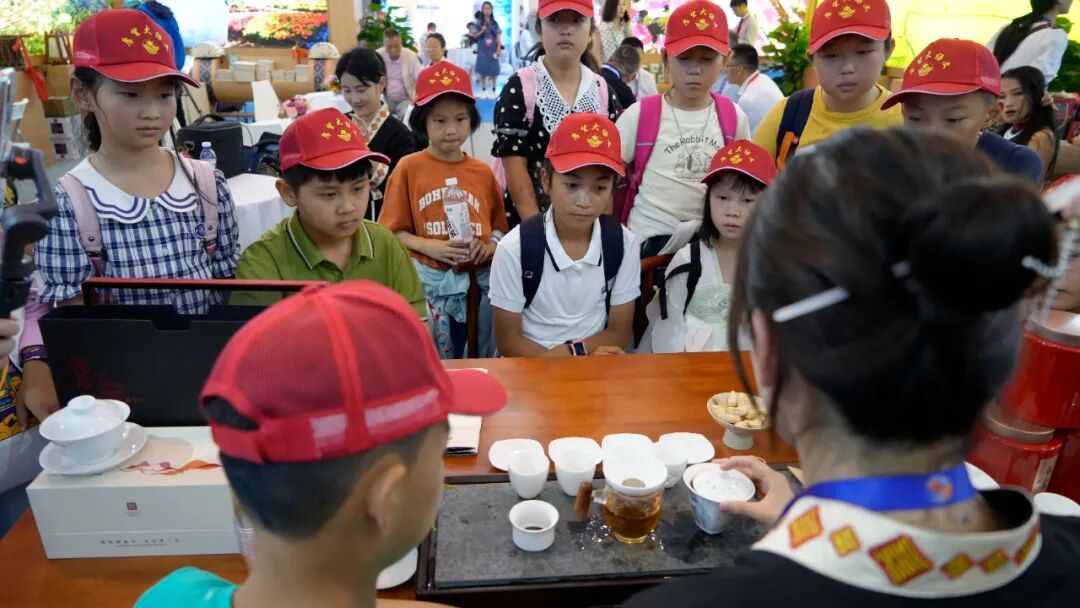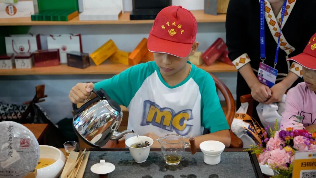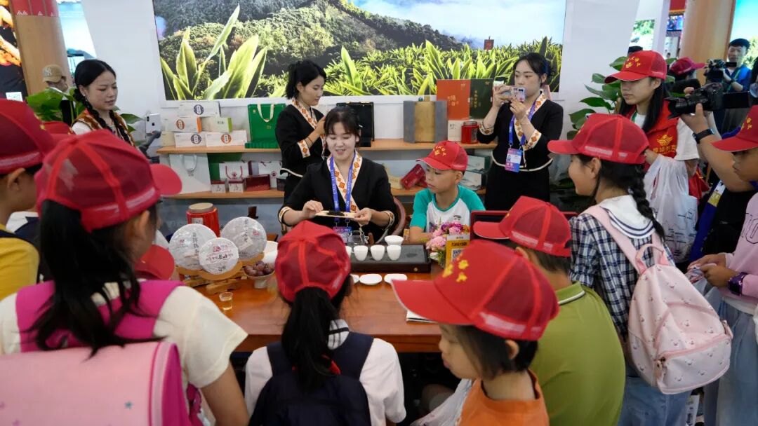 第7届南博会第二天,临沧文化旅游主题馆迎来一群特殊的记者团队,平均年龄8岁的小记者们在临沧文化旅游馆内和茶艺师学泡茶、与5岁的宰坎旺学跳马鹿舞。