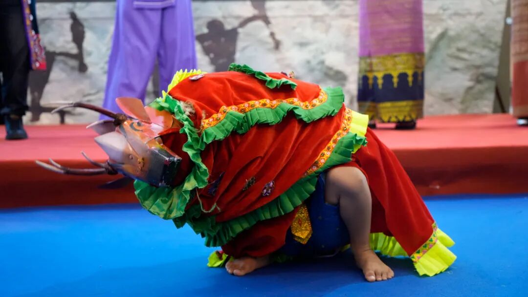 这是5岁金浩宇(傣名宰坎旺)第一次登上如此大规模的舞台,在后台这个蹦蹦跳跳的孩子显得懵懂。宰坎旺表演的是云南省非遗项目——马鹿舞,马鹿舞是模仿马鹿的跑、跳、抖身、翻滚等动作,用于喜庆祈福场合的拟兽道具舞。每逢泼水节等民间节庆活动,傣族群众都要扎制白象、马鹿道具跳舞,以祈求上苍保佑,风调雨顺、国泰民安。观众们看着宰坎旺在舞台上飞舞,不禁被他的表演所打动。他的舞蹈不仅展现了临沧传统民族文化的独特魅力,更传递出了一种对传统文化的热爱和传承的责任感。
