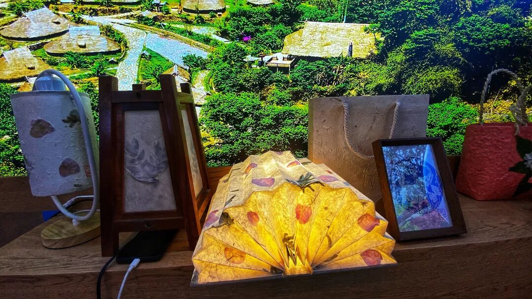 临沧孟定芒团傣族手工造纸传承人艾叶说:“这次南博会我们带来的纸成品有木头台灯、花草纸的书灯和台灯,还有一些纸做的包包、抽纸盒、糖果盒。还有一些不同封面的傣族手工造纸工艺,自己创新一部分,加入叶子鲜花,每个本子都是独一无二的。这么好看的艺术品,快来打卡吧。”