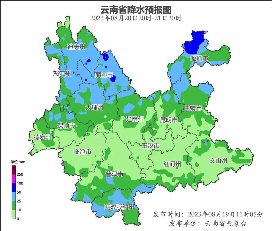 昭通市、曲靖市北部、昆明市北部、楚雄州北部、丽江市、迪庆州南部、怒江州、大理州北部阴有大雨局部暴雨、大暴雨,曲靖市南部、昆明市中部、楚雄州中部、迪庆州北部、大理州南部、保山市北部、德宏州北部、普洱市南部、西双版纳州多云间阴有中雨局部大雨,其他地区多云有阵雨局部中雨。