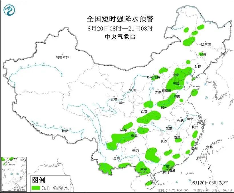中央气象台8月20日6时发布暴雨蓝色预警: