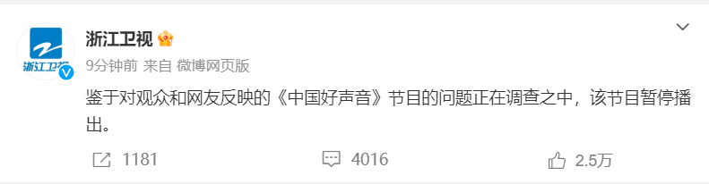 《中国好声音》节目暂停播出 2023-08-25 11:58 浙江卫视官方微博 0 .刚刚,浙江卫视官方微博发布消息:鉴于对观众和网友反映的《中国好声音》节目的问题正在调查之中,该节目暂停播出。来源:浙江卫视官方微博责编 刘榕杉审核 李文女