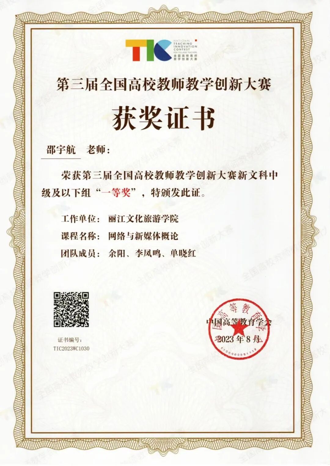 近日,由教育部高等教育司指导、中国高等教育学会主办的第三届全国高校教师教学创新大赛在浙江大学落幕。丽江文化旅游学院在本届大赛中,取得历史性突破。其中,邵宇航老师荣获一等奖,陈强老师荣获二等奖。