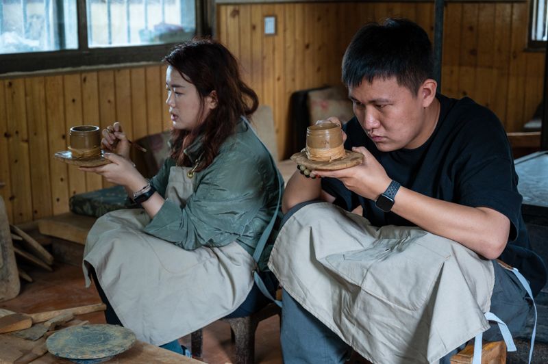 想要深入了解黑陶制作技艺,走进汤堆村是最直接的方式。在鲁茸恩主家的黑陶工作室里,四位来自上海的青年男女正在对手中的泥胚进行塑形,鲁茸恩主在旁传授着塑形的技巧。自从成立了工作室,鲁茸恩主每年都要接待来自全国各地的游客前来体验黑陶制作技艺。汤堆村有很多黑陶技艺体验工坊,在工坊里,可以近距离观察制陶人的工作过程,感受他们对泥土的驾驭和情感的投入。从原材料的选择到成品的呈现,每一个环节都是一次精湛技艺和智慧的体现。亲身体验一次黑陶制作技艺,与陶土亲密接触,感受泥土在手中的温度和质感,每一次轻捏、拉拽,都是对艺术的深刻思考和情感的投入,让人与艺术更加亲近。