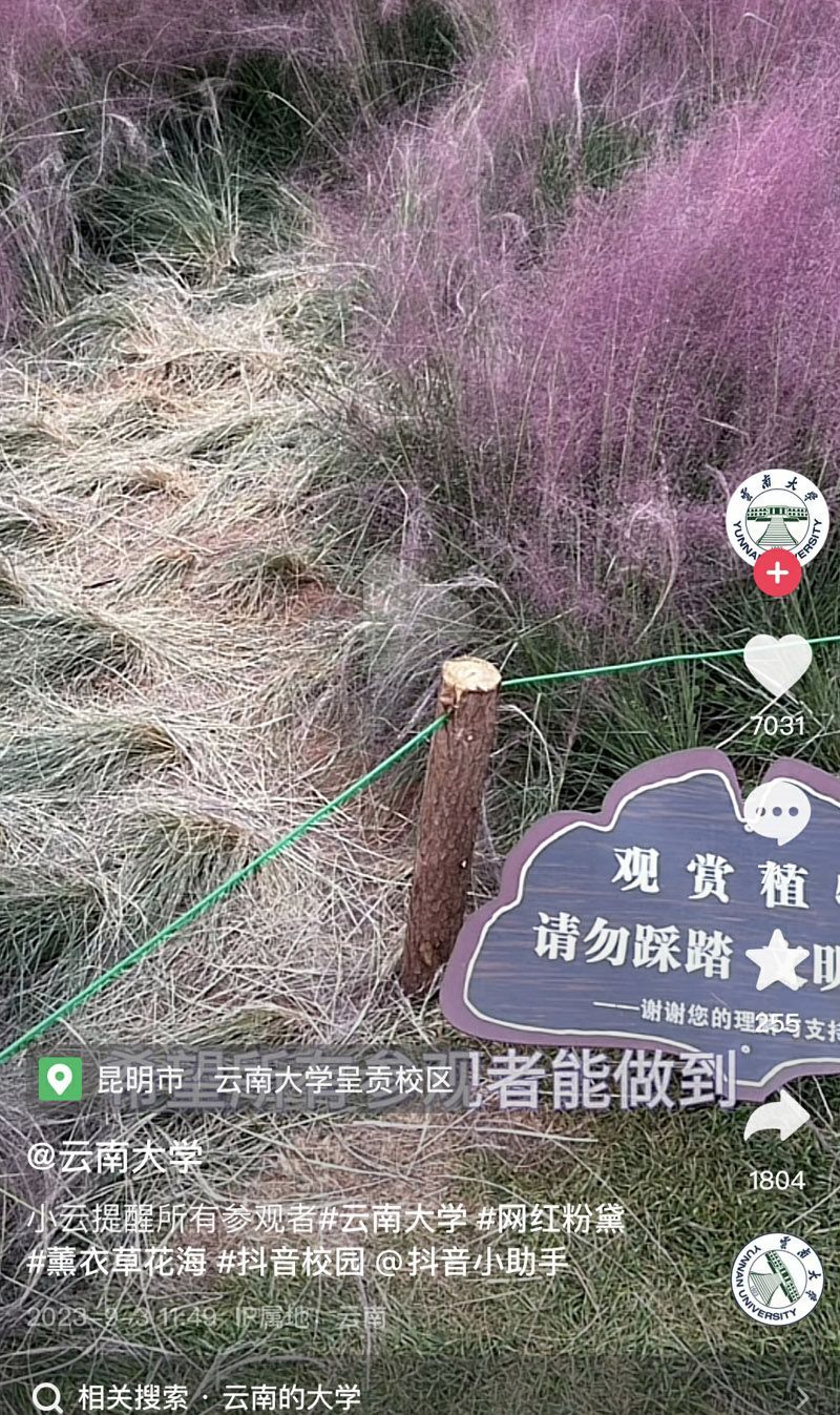 (被踩踏的粉黛草 “云南大学”抖音视频截图)