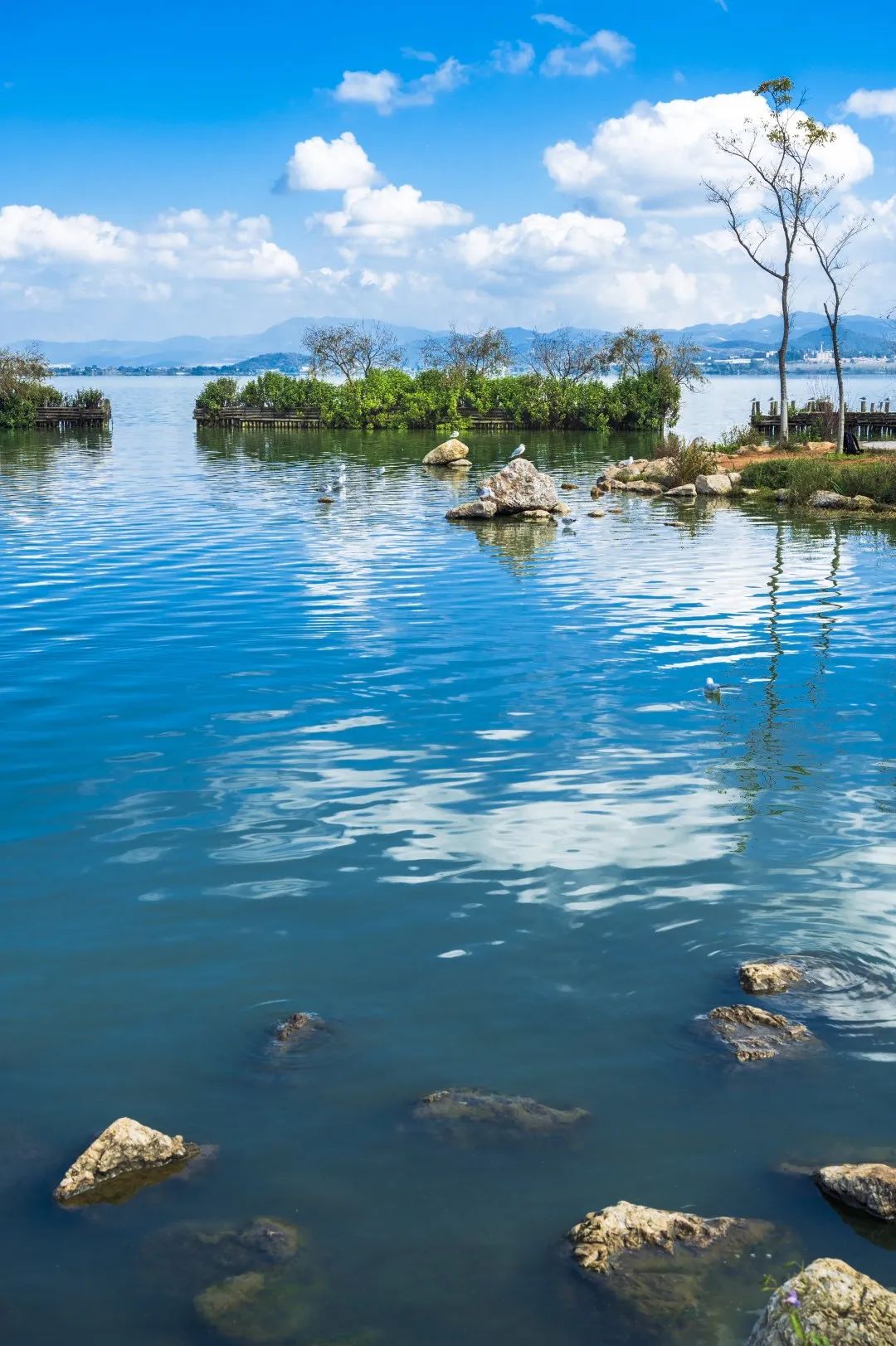 在凉爽明媚的秋天,来到滇池畔,看看蓝天白云下的碧波荡漾,海埂公园岸边树木葱翠、绿道蜿蜒、湖光山色移步换景。人们在湖边的绿道上遛狗散步、结对骑行或休息小憩。可休闲野餐,也可拍写真,不时有欢快的笑声回荡在湖畔,氛围和谐宁静,令人陶醉,呈现出一幅“只此青绿”的美丽生态画卷。