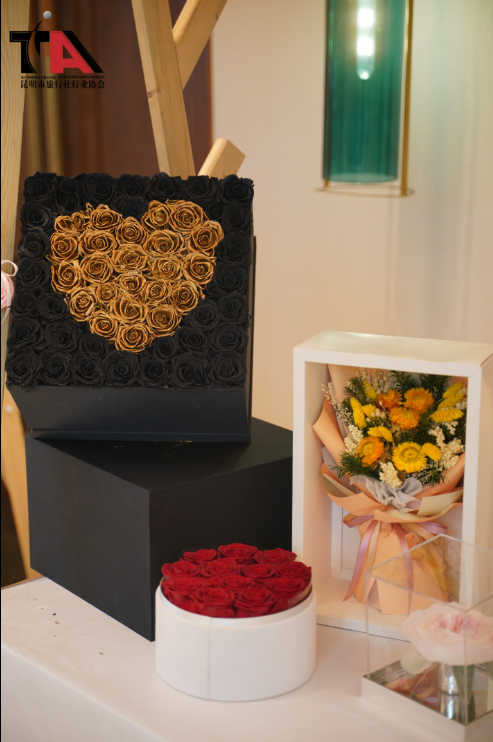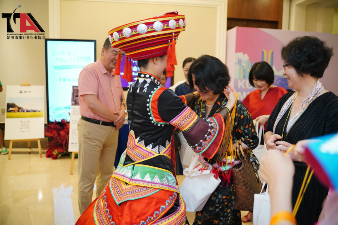推介会上,舞蹈《雀之灵》《花腰歌舞》、沙画表演《我跟春城有场约定》等多种生动活泼的方式,展示了丰富多彩的昆明文旅资源和别具一格的文化风情。在非遗项目展示区,以云南三迤酒业非遗项目玫瑰老卤酒、石林彝绣、宜良九乡麦田窑柴烧铁陶、瓦猫、安宁扎染等具有昆明特色的非遗项目吸引与会嘉宾驻足问询;昆明吾爱咖啡有限公司的冷萃咖啡原液、滇黄精、云南岩莱茶业有限公司的普洱茶、昆明德天餐饮有限公司为本次活动独家定制的自嗨锅鲜花过桥米线、云南方旭贸易提供的永生花、烧饵块、花糖、鲜花饼等昆明特色美食也被带到推介会现场,让企业家、旅行商感受“昆明味道”。同时作为本次活动的指定用车——比亚迪 腾势汽车对推介会也给予大力支持。