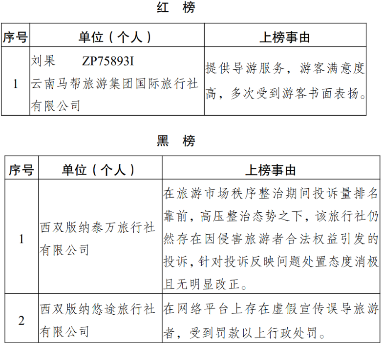 根据《云南省人民政府关于印发云南省旅游市场秩序整治工作措施的通知》(云政发〔2017〕19号)及《云南省加强旅游市场秩序整治若干工作措施》(云旅整治办〔2023〕1号)等文件要求,现将诚信守法的文旅企业和从业人员纳入红榜,予以通报表扬;将违反文旅相关法律法规受到行政处罚的文旅企业和从业人员纳入黑榜,予以通报警戒,并纳入重点监管;被吊销业务经营许可证或从业资质的单位或个人将列入行业禁入管理。现将2023年度第8期“红黑榜”进行公布,接受社会监督。
