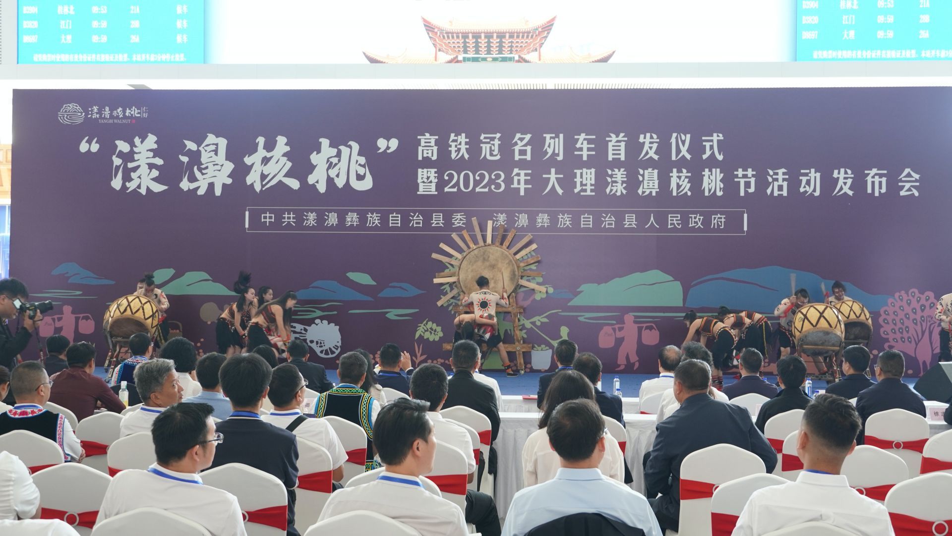 9月16日,“漾濞核桃”高铁冠名列车品牌宣传首发仪式暨“2023年大理漾濞核桃节”活动发布会在昆明高铁南站举行,这是2023年大理漾濞核桃节系列活动之一。