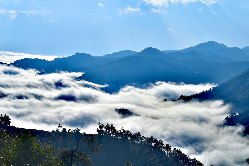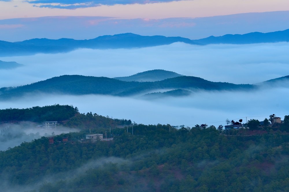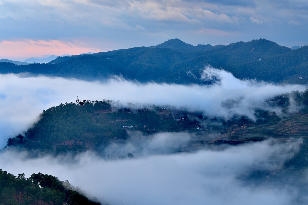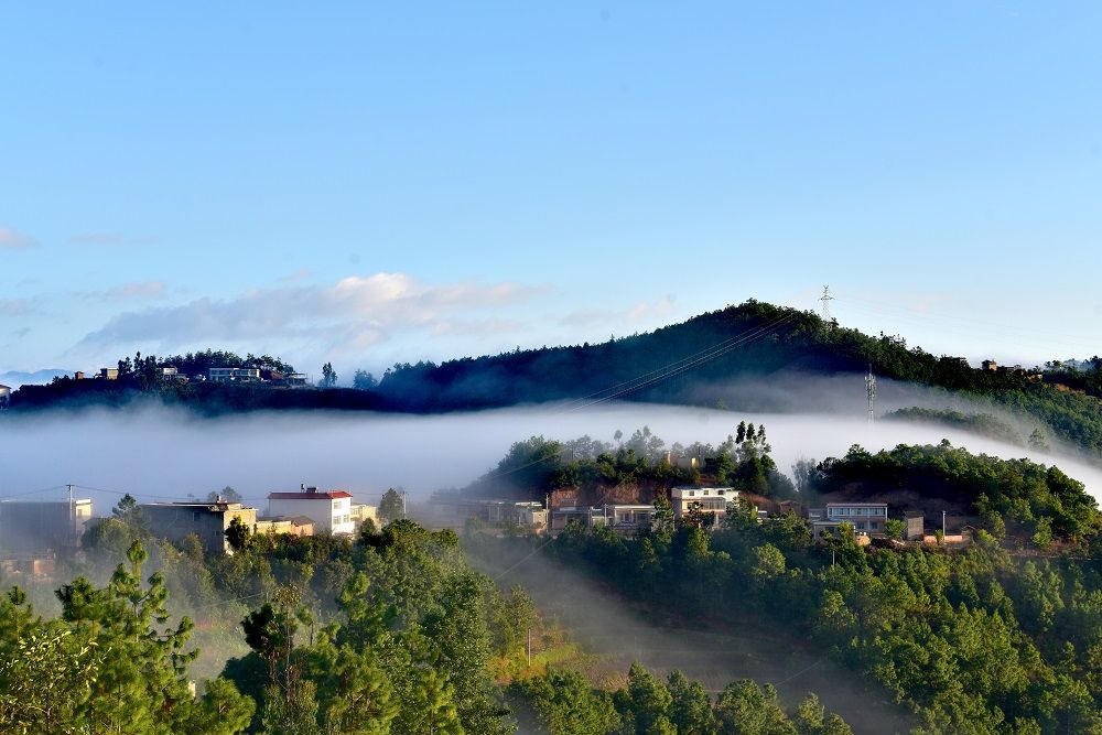 清晨,驱车行进在南(华)景(东)公路沙桥、五街路段上,寻一处空地停车观景,可以一览美丽村庄与层层叠叠的远山,以及那如轻纱般的云雾。