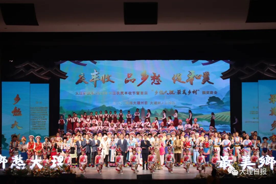 9月22日晚,在2023年中国农民丰收节来临之际,由中共大理州委、大理州人民政府主办的大理州庆祝2023年中国农民丰收节暨首届“乡愁大理·最美乡村”颁奖晚会在州群艺馆举行。晚会以“庆丰收 品乡愁 促和美”为主题,分“丰收的喜悦”“舌尖的味道”“乡愁的记忆”“乡土的眷恋”“绿色的田野”5个版块,集视频展示、文艺表演、讲述、同步电商销售等形式于一体,充分展示大理宜居宜业和美乡村建设成果,传承弘扬乡愁文化,提升大理作为“乡愁”之地的标识度、知名度,讲好大理乡村振兴故事,营造城乡共庆共祝共享丰收的浓厚氛围。