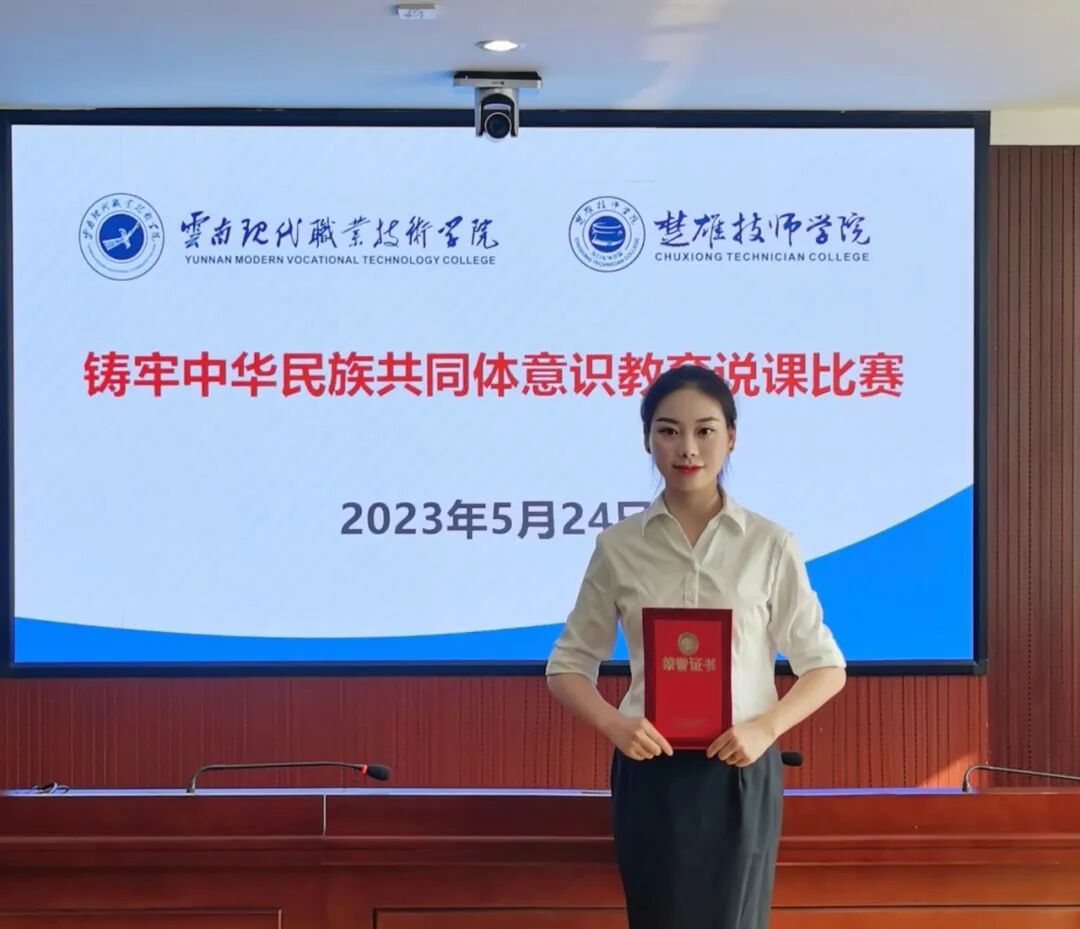 由云南省民族宗教事务委员会、云南省教育厅、云南省人力资源和社会保障厅共同主办的2023 年云南省学校铸牢中华民族共同体意识教育说课比赛于9月23-24日在云南省民族中学进行。由云南现代职业技术学院马克思主义学院组织院内初赛后,推选朱欣婧和郭飞飞两名教师参加省赛,经激烈角逐,朱欣婧老师荣获一等奖,郭飞飞老师荣获二等奖。其中朱欣婧老师由云南民族博物馆优先聘用为铸牢中华民族共同体意识教育实践基地宣讲员。