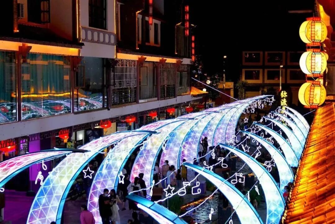 比起白天,夜晚的弥城更显温柔可亲,绚烂光影交织下,浓浓的人间烟火味从弥渡美食街里散发出来。