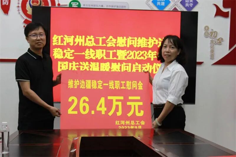 9月28日,红河州工会慰问维护边疆稳定一线职工暨2023年中秋国庆送温暖慰问活动启动仪式在河口县举行。红河州政协副主席、州总工会主席张艳梅出席启动仪式并讲话。张艳梅表示,边境安全是国家安全的重要组成部分,是维护国家主权和领土完整的重要保障。联防队员是边陲守卫战线上一道坚固的屏障,是维护国家主权、领土完整、安全稳定的重要力量。作为联防队员,要时刻把国家和人民的利益放在心中,始终保持高度的警惕,牢牢守卫着祖国的边境线。在中秋、国庆两节即将到来之际,提前祝大家中秋、国庆快乐,平安健康。