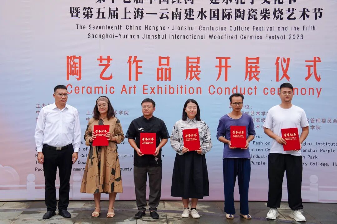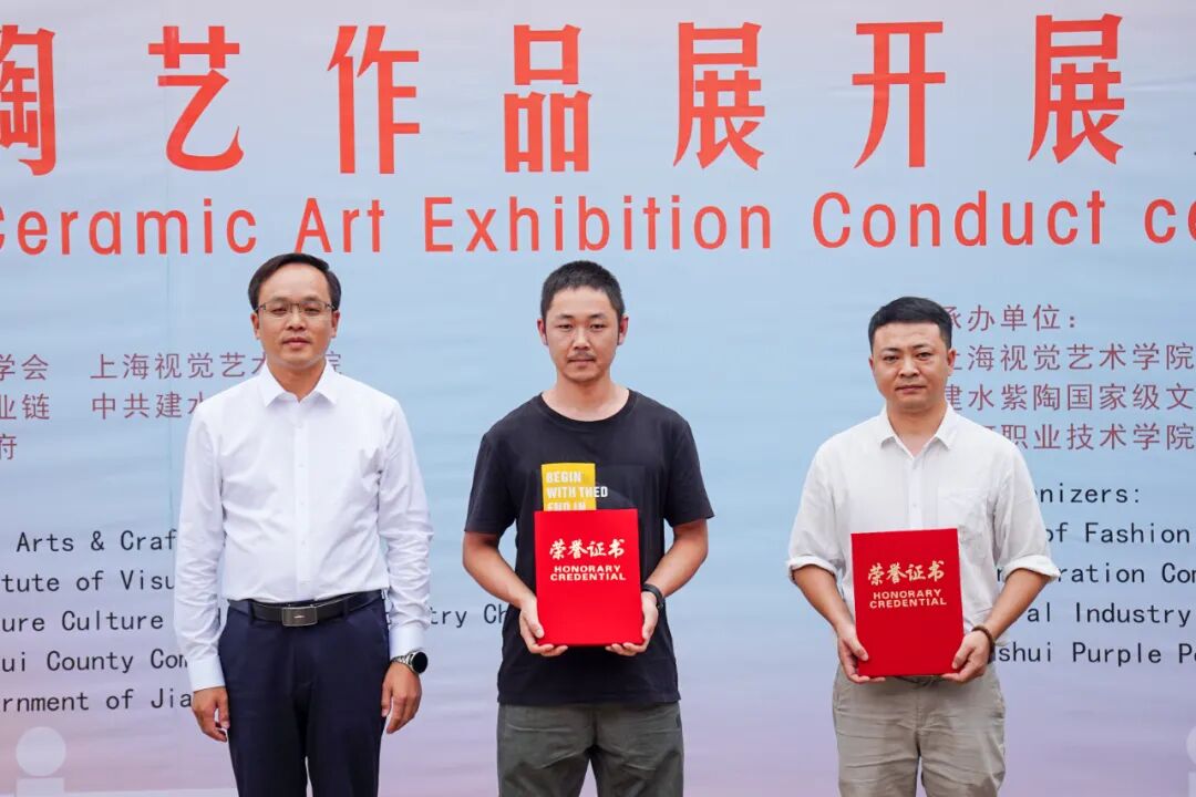 作品展现场,与会领导向国内外陶艺家颁赠证书及建水紫陶作品获奖证书。