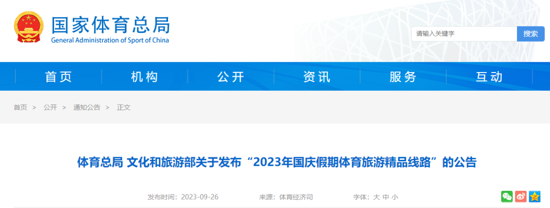 为深入贯彻党的二十大精神,全面落实“健康中国”国家战略,践行“绿水青山就是金山银山”“冰天雪地也是金山银山”发展理念,促进体育产业与旅游产业融合发展,释放体育消费和旅游消费潜力,满足人民群众不断增长的户外运动和旅游休闲需求,体育总局、文化和旅游部联合发布“2023年国庆假期体育旅游精品线路”。它们是: