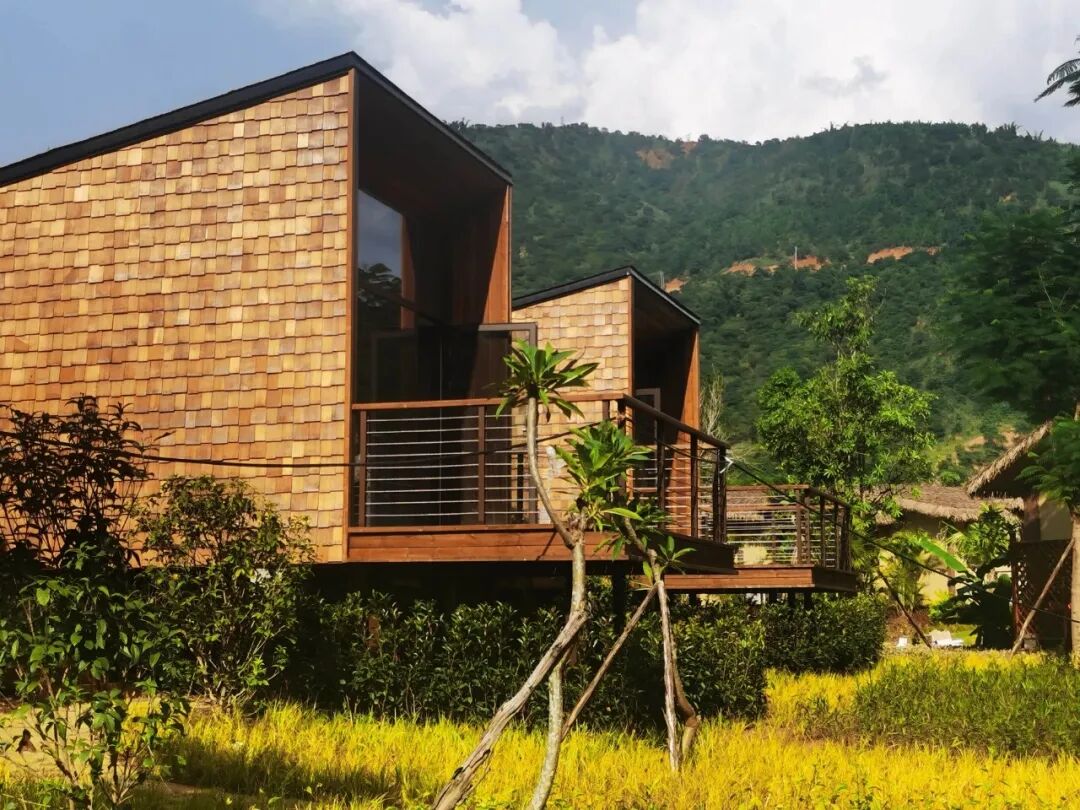 背靠哀牢山,沿着旖旎的戛洒江,一间间茅草顶的森系小木屋,网红树屋,浪漫星空房错落分布在园区内。在体验傣式林间住宿的同时还能打卡火遍全网的“明星度假同款”。