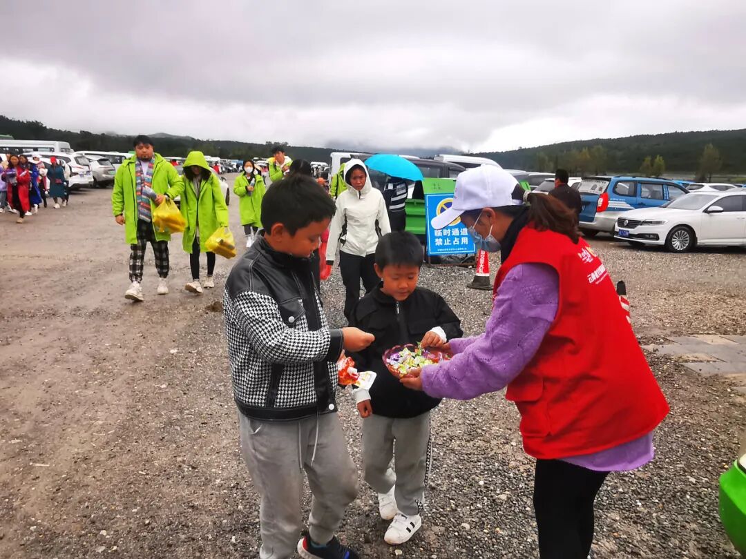 早晨,山上下起了雨,气温比较低,在应急停车场,景区工作人员贴心地准备了热水、小糖果等物品。“今天天气比较凉,大家可以过来喝一杯热水,吃点糖果,休息一下。”每每遇到游客,志愿者都热情地招呼。当有老人和小朋友时,志愿者还会远远地迎上去,及时将温暖送到他们手中。