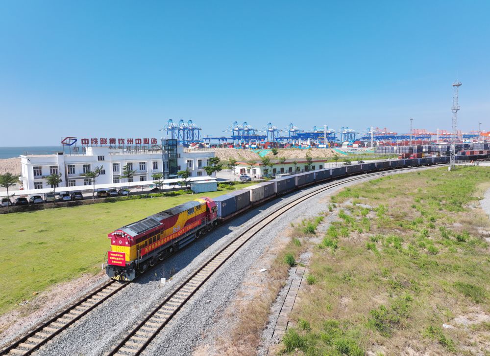 10月8日,一列满载印尼起酥油、越南红薯淀粉、海南椰子汁等110个集装箱的海铁联运班列,从广西钦州铁路集装箱中心站开出,驶向重庆团结村站,标志着西部陆海新通道海铁联运班列第30000列成功发车。(来源:新华社)
