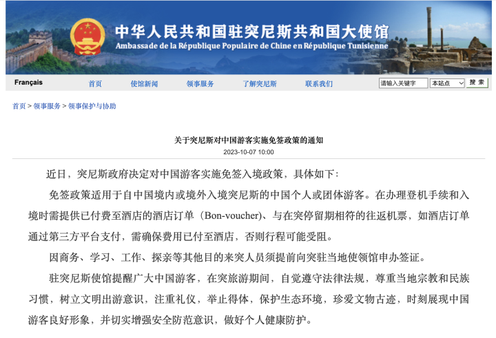 近日,中华人民共和国驻突尼斯共和国大使馆发布消息称,突尼斯政府决定对中国游客实施免签入境政策。免签政策适用于自中国境内或境外入境突尼斯的中国个人或团体游客,中国游客在办理登机手续和入境时需提供酒店订单和与在突停留期相符的往返机票。(来源:中国旅游新闻客户端)