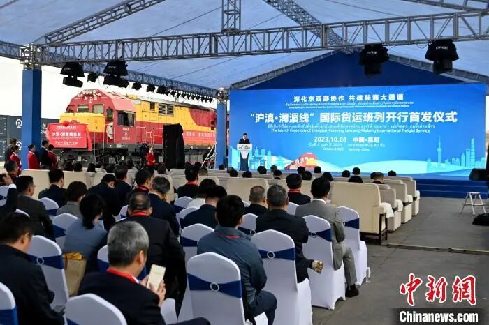 (10月8日,“沪滇·澜湄线”国际货运班列在云南省昆明市王家营西站举行开行首发仪式。中新社记者 李嘉娴 摄)
