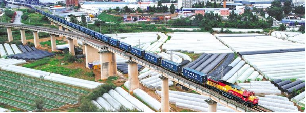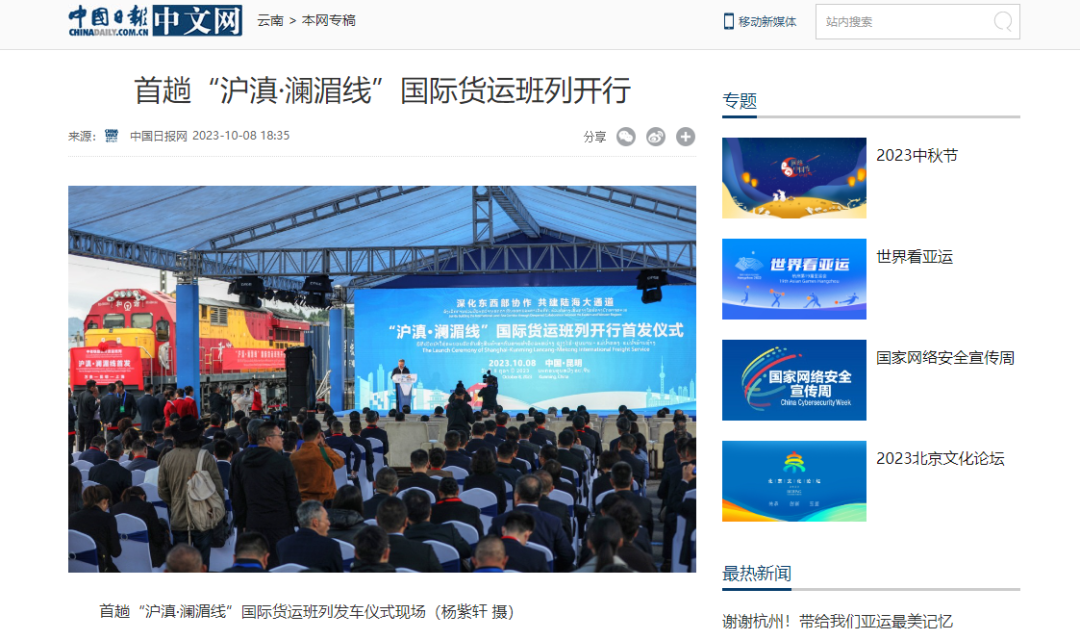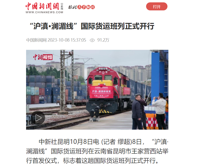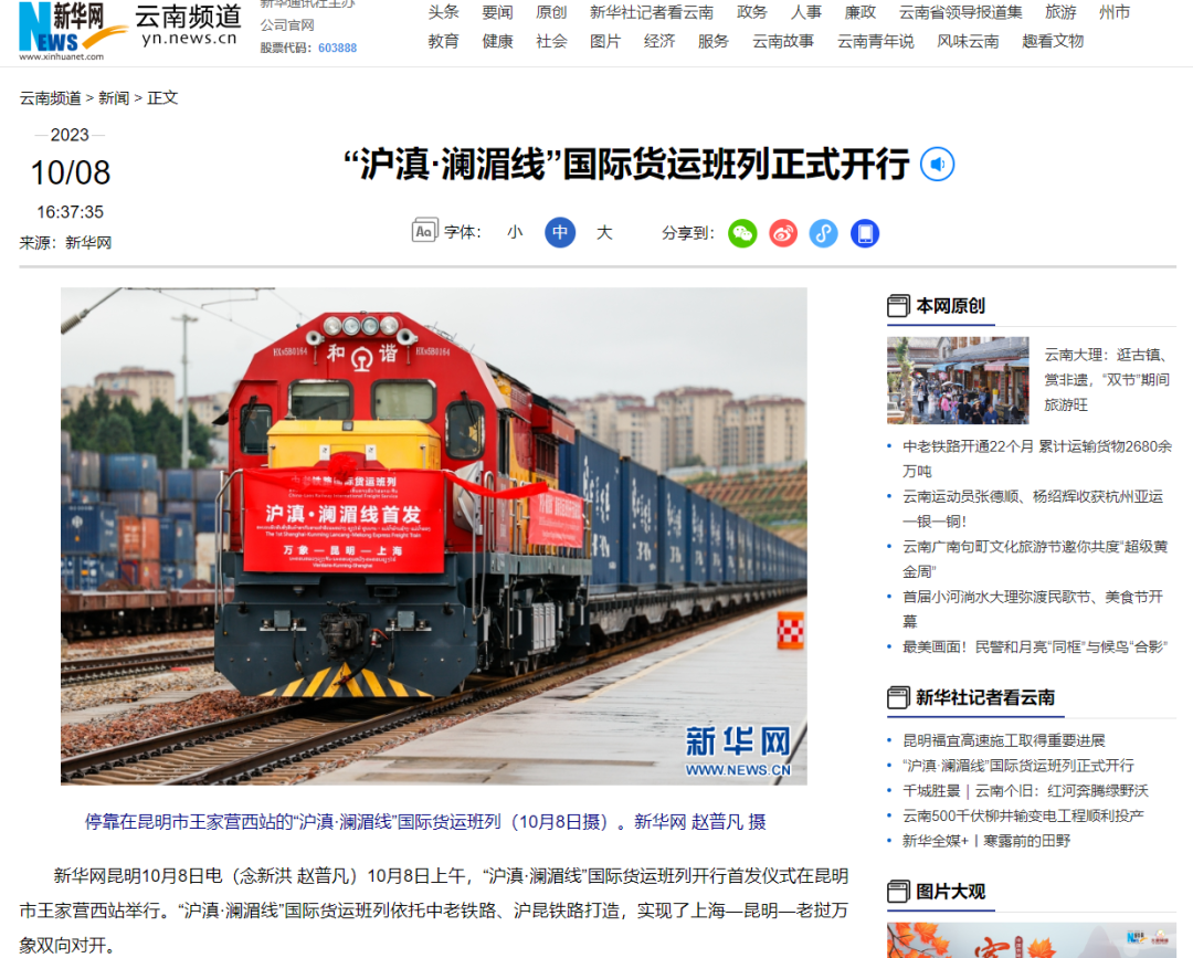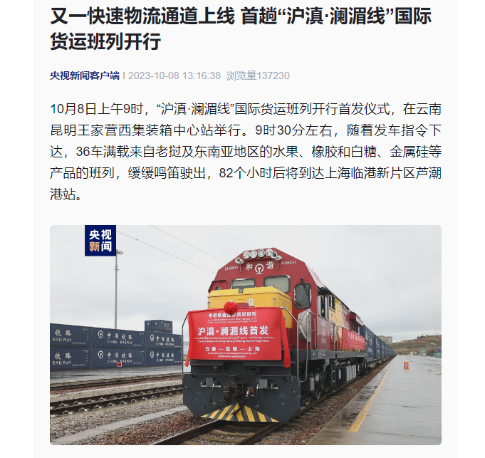 10月8日,首趟“沪滇·澜湄线”国际货运班列开行。依托中老铁路打造的“沪滇•澜湄线”国际货运班列从上海出发经昆明抵达老挝,全程3756公里,采用双向对开形式,预计用时4至5天,比原有铁路运输时间缩短了10天左右。
