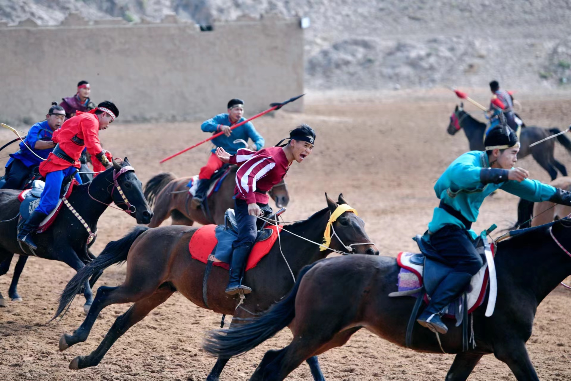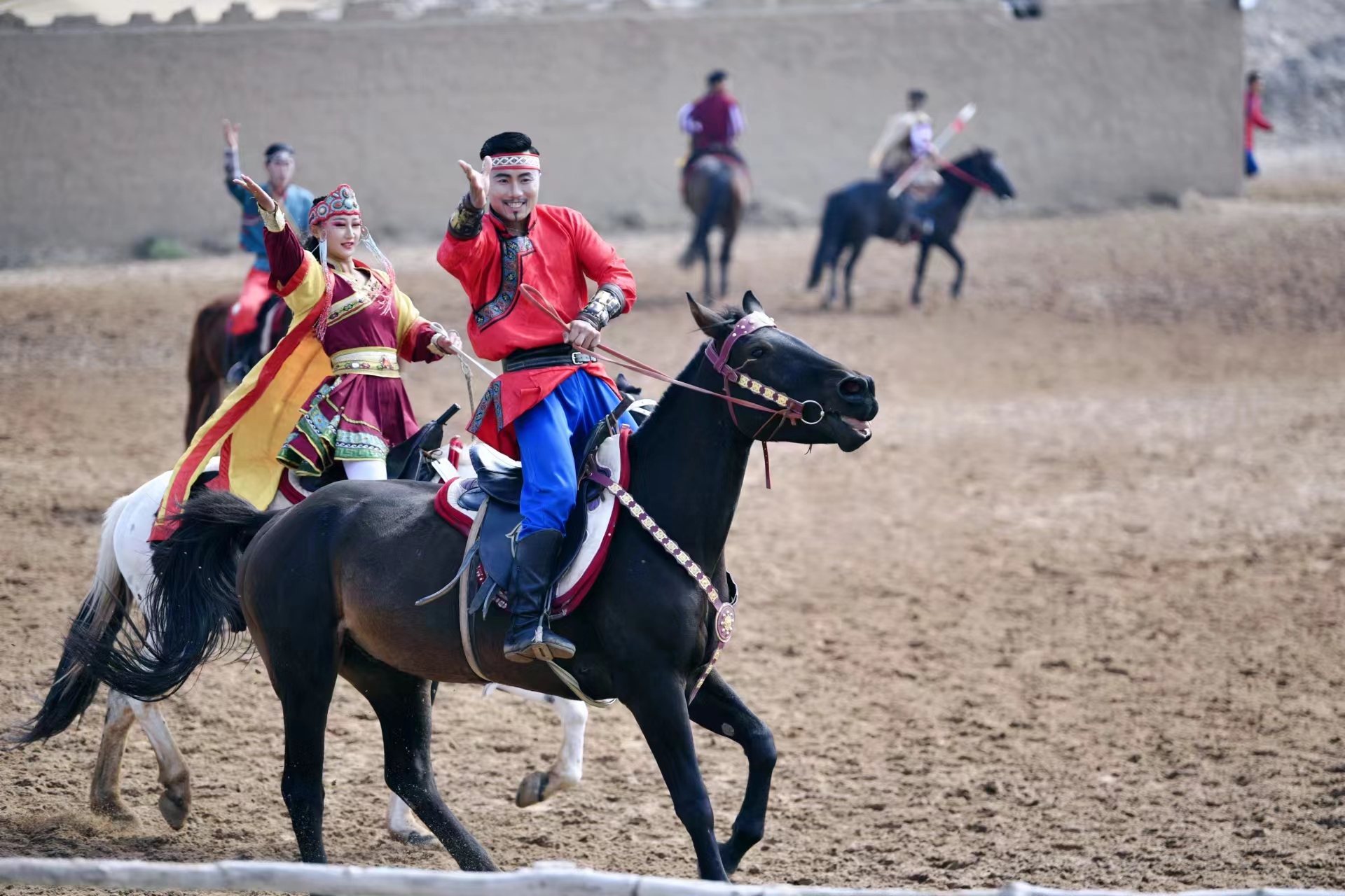 10月10日,在水洞沟景区大型实景马战史诗剧《北疆天歌》演出现场,战鼓声声、马蹄阵阵,冷兵器时代的马背英雄赢得“2023全国都市报+新媒体总编辑宁夏行”调研采访团成员的阵阵喝彩。