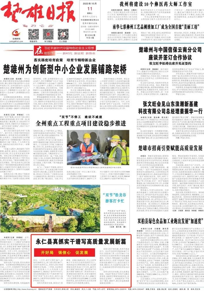 近日,记者从“开好局、强信心、促发展——贯彻落实党的二十大精神”系列新闻发布会·永仁县专场新闻发布会上获悉,永仁县锚定省委“3815”战略发展目标,经济社会建设取得一系列标志性成果。今年上半年,全县地区生产总值同比增长4.1%,固定资产投资增长8.6%,社会消费品零售总额增长12.8%,城乡居民人均可支配收入分别增长3.9%、8.3%。坚持大抓产业发展,经济发展创新局。全县林果提质增效面积达1.45万亩,上半年,实现林果产值5.47亿元;麦冲河12.5万千瓦光伏电站建成并网,宜莲53万千瓦光伏电站全容量建成;成功创建方山AAAA级、外普拉AAA级旅游景区。上半年,全县接待游客90.33万人(次),旅游总收入同比增长24.29%。坚持大抓协调发展,发展基础再夯实。上半年,新开工项目38个,总投资25.87亿元,竣工重大项目81个,总投资22.25亿元,省重大项目用地保障率达75.4%。三季度,全县脱贫人口和监测人口人均纯收入达12250.07元,增速高于全州平均水平;高标准规划建设31个行政村、95个自然村“四美”乡村示范点,成功入选2023年云南省传统村落集中连片保护利用示范县。坚持大抓绿色发展,绿美永仁绘新画。县城古城商业区、中山公园等16个片区雨污分流改造项目完工,更新改造雨污管网14.6公里;全县新增绿化面积31.12万平方米,猛虎乡获评省级“绿美乡镇”、昔丙等8个村获评省级“森林乡村”、阿朵所水库入选省级美丽河湖名单;全面实施农村“两污”治理攻坚行动,投入2500万元中央预算内资金和2000万元县级财政资金,进行自然村生活污水治理和镇村生活垃圾收集点建设。坚持大抓开放发展,改革开放迸活力。企业开办时间压缩至0.18个工作日,宜莲(班三界、小木马)30万千瓦光伏电站在全省同类项目中获批速度最快。1至8月,帮助4183户企业解决融资11.71亿元,发放“贷免扶补”创业担保贷款1033.7万元;成功引进压力容器、塑胶瓦、电力设备等企业落户永仁,完成招商引资州外到位资金31.3亿元。坚持大抓共享发展,民生改善显成效。幸福里“管家式”劳务平台模式获省委、省政府主要领导高度肯定,其经验在全省推广。高效能抓实“平安永仁”建设,2022年,群众安全感满意度排名全省第一。