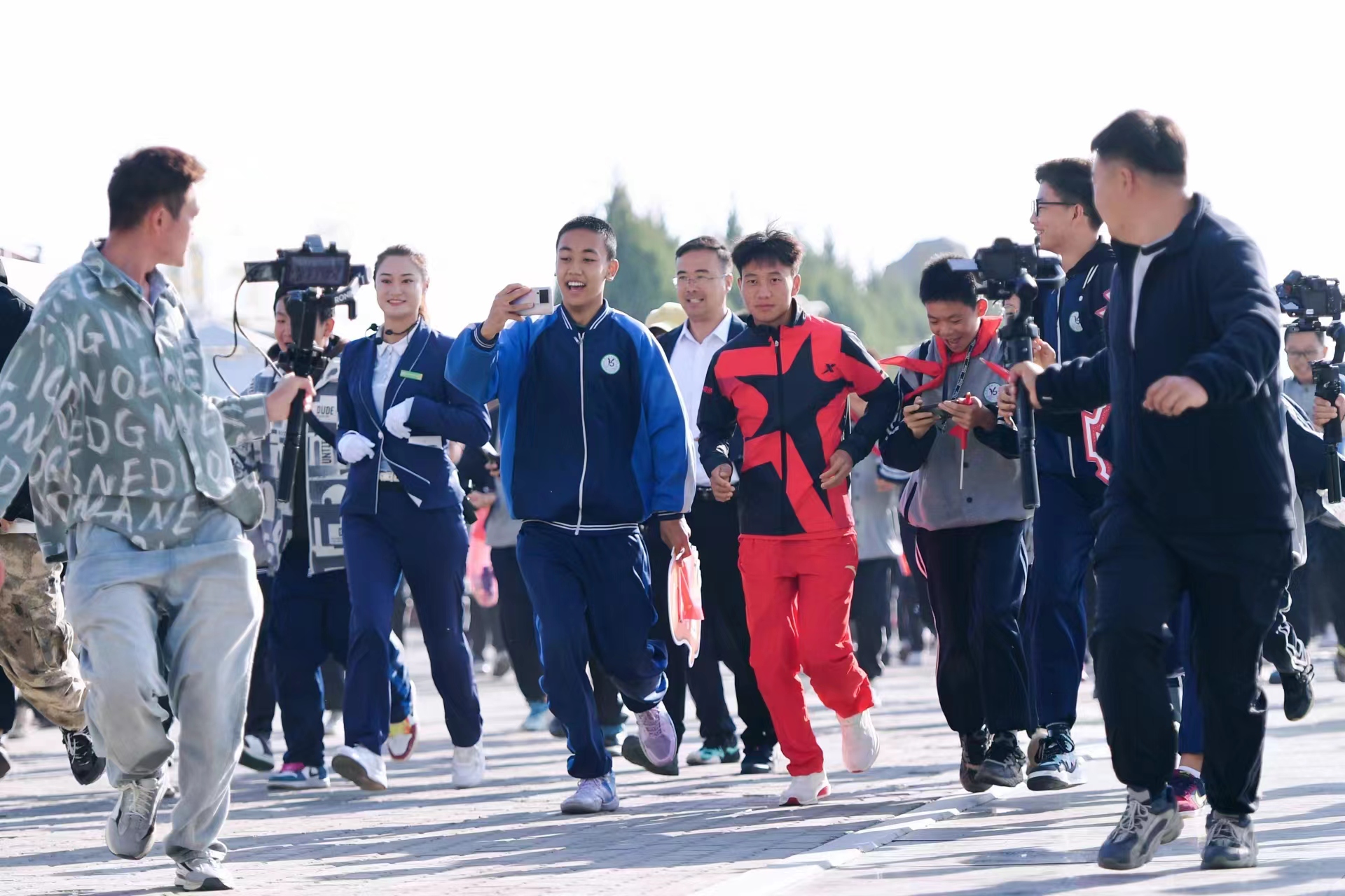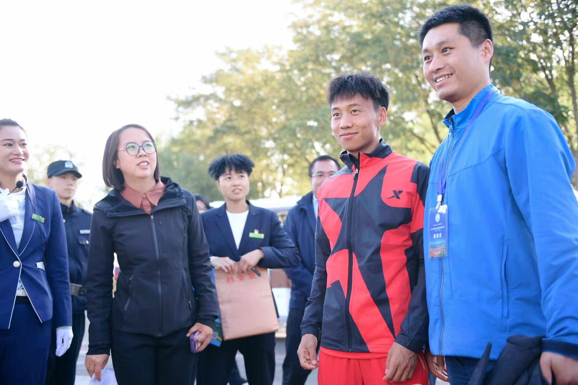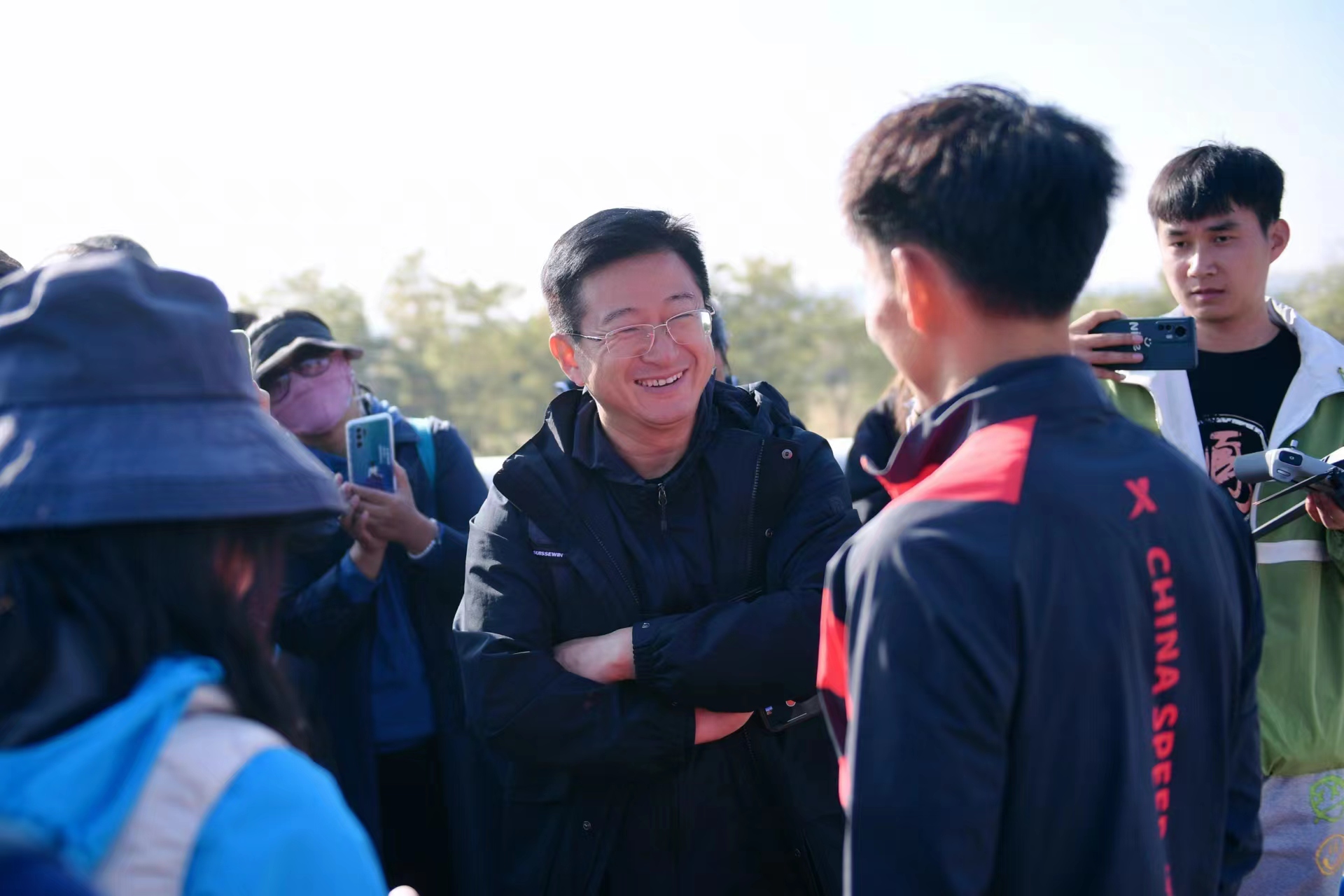 当天上午,何杰在领跑活动中,与千名学子奔跑在沙湖的湖东湿地健身跑道上,进行了一场“传递榜样力量”的长跑活动。在何杰的带领下,学子们跟随冠军的步伐,感受长跑运动的魅力和沙湖湿地的自然生态之美。