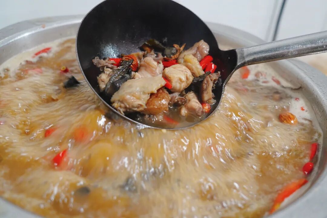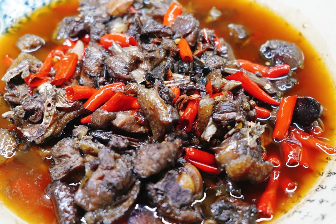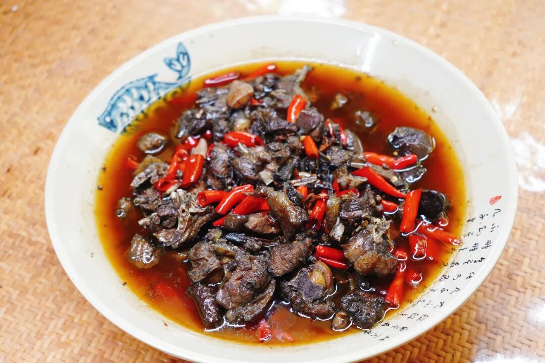 黑色的大块干巴菌、黑色的乌骨鸡,再配以红色的辣椒,拈起一块干巴菌或是鸡肉放入嘴中,菌香都会在嘴里瞬间弥漫开来,一时竟不知是干巴菌赋予了土鸡灵魂,还是土鸡释放了干巴菌的精华,就连收汁出的汤汁,无论拌饭还是拌面都是上乘之选,让人欲罢不能。