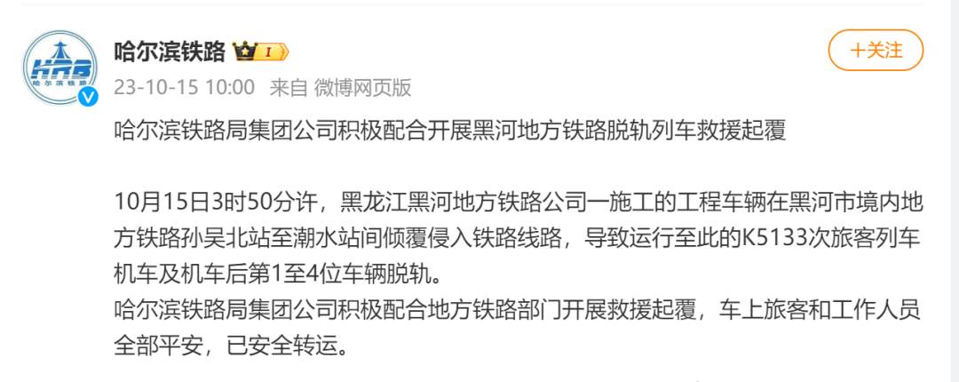 15日10时,@哈尔滨铁路 发布情况通报,称10月15日3时50分许,黑龙江黑河地方铁路公司一施工的工程车辆在黑河市境内地方铁路孙吴北站至潮水站间倾覆侵入铁路线路,导致运行至此的K5133次旅客列车机车及机车后第1至4位车辆脱轨。