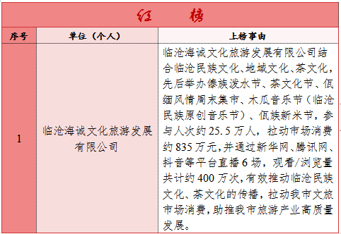 为宣传典范、树立行业标杆,引导和激励文化旅游行业诚信规范经营,提升文化旅游服务质量,助推临沧文化旅游产业高质量发展。经临沧市文化和旅游局、临沧市旅游行业协会研究,决定向社会公布临沧市文化旅游行业“红黑榜”总第十九期上榜名单。