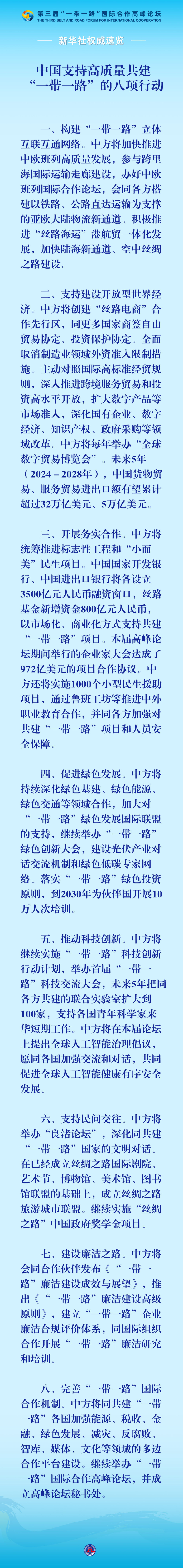 习近平宣布中国支持高质量共建“一带一路”的八项行动 2023-10-18 13:30 新华社 0 10月18日,国家主席习近平在第三届“一带一路”国际合作高峰论坛开幕式上发表主旨演讲,宣布中国支持高质量共建“一带一路”的八项行动。 来源 新华社 责编 杨奥 审核 华芳