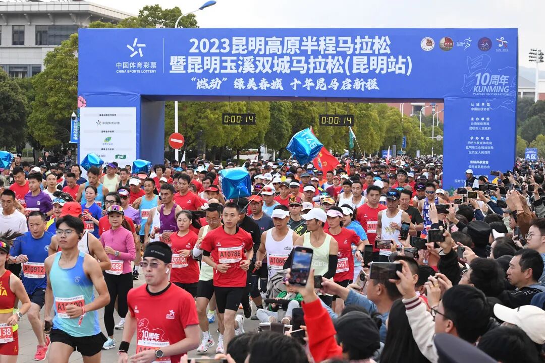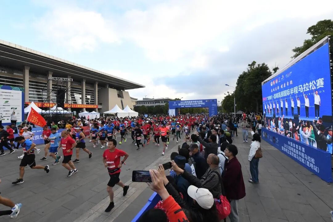 10月22日上午8点,“中国体育彩票”2023昆明高原半程马拉松暨昆明玉溪双城马拉松(昆明站)在昆明会堂鸣枪起跑,1.5万名国内外选手用脚步丈量大美春城。